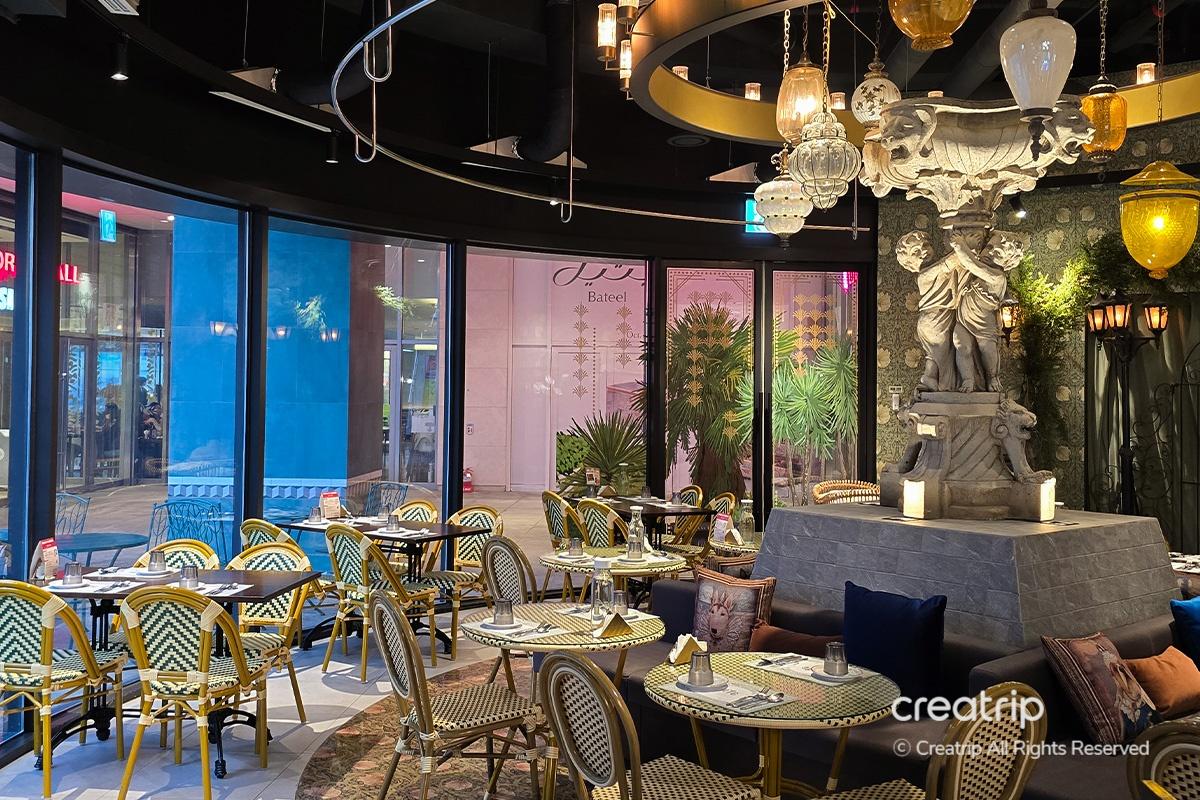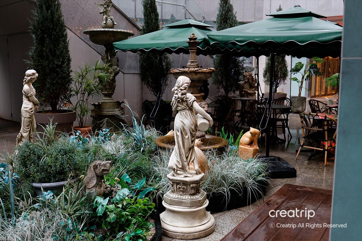 Das insgesamt grüne Interieur vermittelt ein angenehmes Gefühl. Der Platz mit den bodentiefen Fenstern außen wirkt offen und geräumig, und die große Statue im Zentrum verleiht einen Hauch von Luxus.