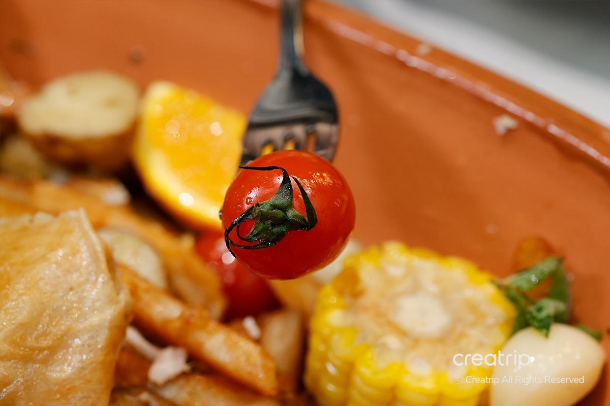 Genießen Sie den Spaß, aus einer Vielzahl von Beilagen zu wählen, darunter Cajun-Pommes, Knoblauch und Kirschtomaten. Die Portion ist wirklich groß, also reicht sie für 3 bis 4 Personen.