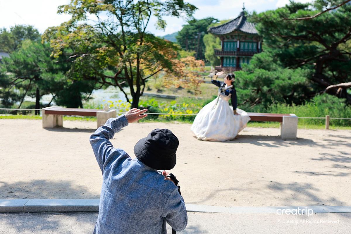 Wir sind zu den Fotoorten des Gyeongbokgung-Palastes gemäß der Anleitung des Fotografen gezogen.Wir haben mit dem Shooting ganz natürlich begonnen.