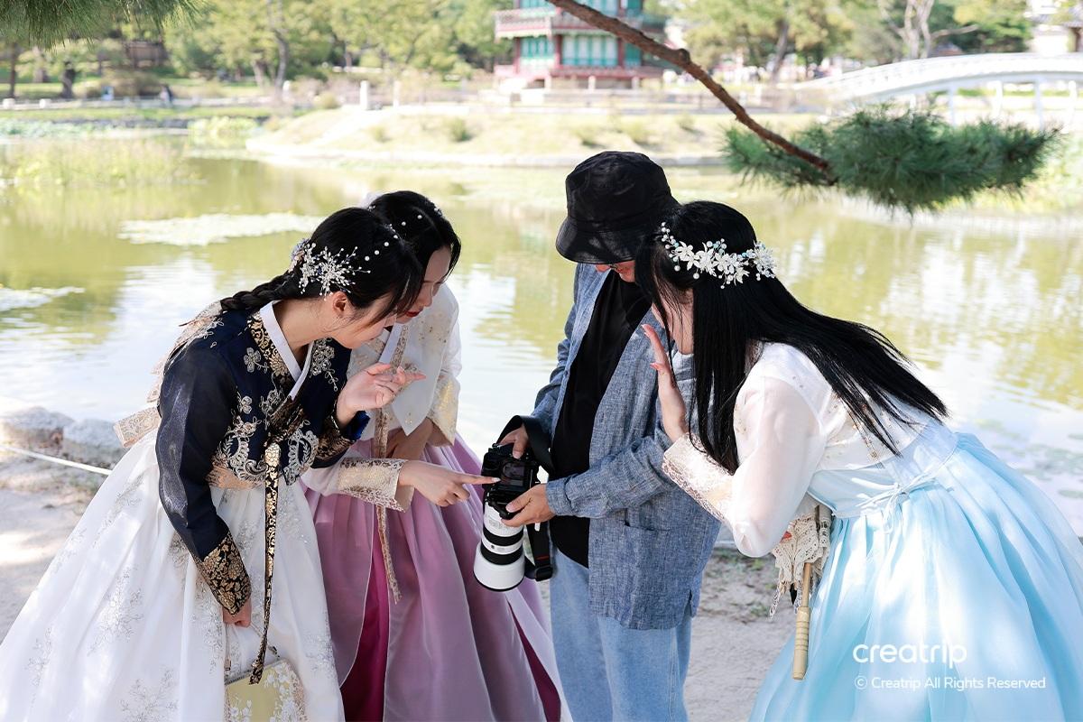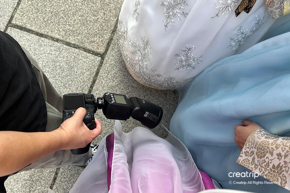 Bevor ich an einen anderen Ort zog, überprüfte ich noch einmal, ob das Foto gut geworden ist.Nach der Überprüfung der Fotos sehen die Menschen großartig aus und die schönen Farben des Hanbok sind in den Bildern gut eingefangen!