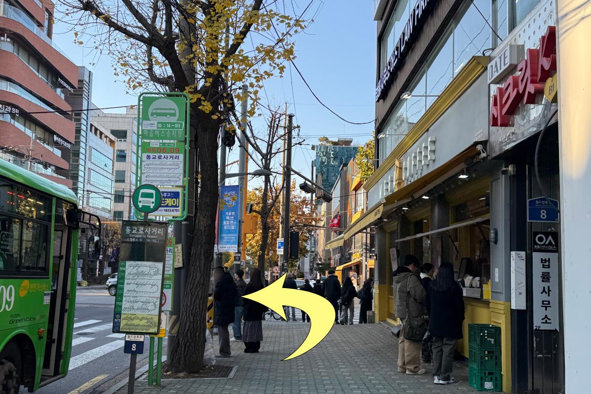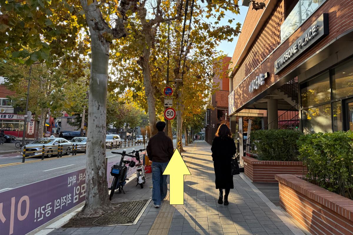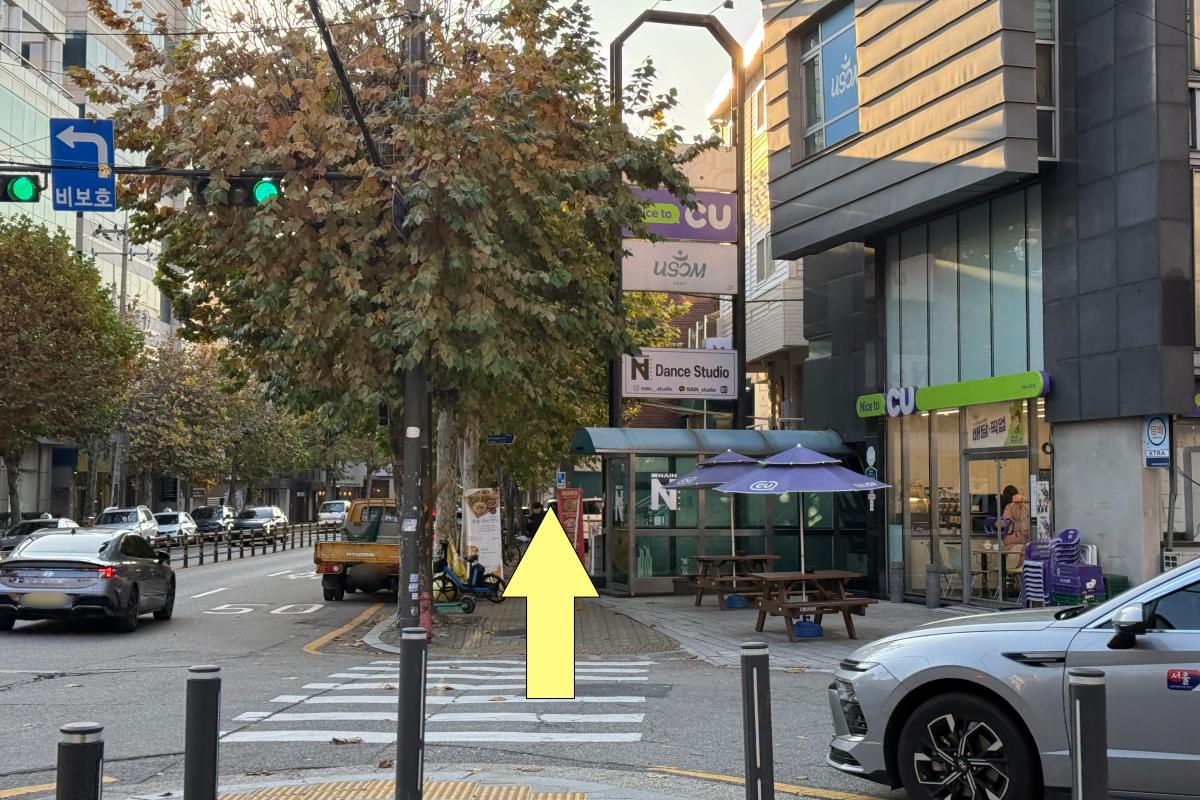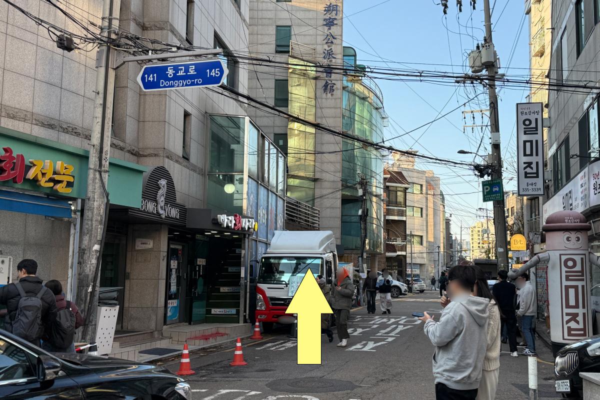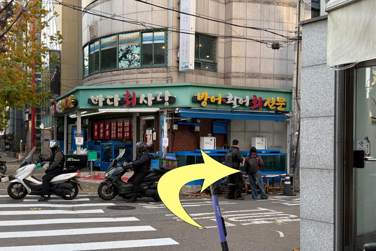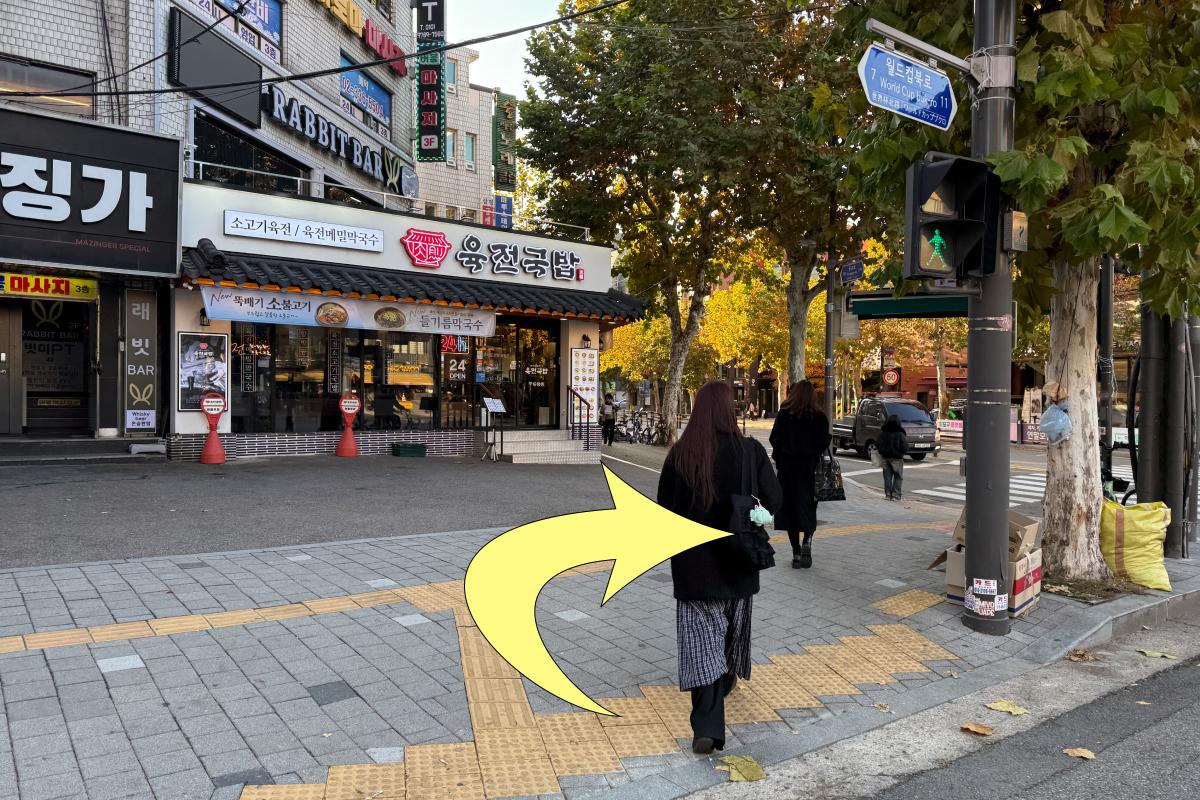 Biegen Sie direkt vor dem Gebäude „Yukjeon Gukbap“ rechts ab.