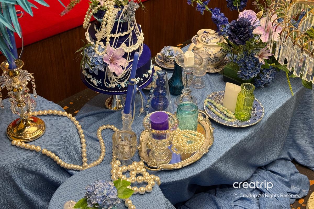 Ein antikes rotes Sofa, zusammen mit einem vor ihm stehenden Tisch, geschmückt mit Kristalldekorationen, Kerzenhaltern und Desserttellern, schuf eine insgesamt an ein klassisches Filmset erinnernde Atmosphäre.