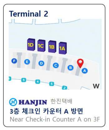 ![]() | Incheon International Airport (ICN) Terminal 2 Ort: 3. Etage, Check-in-Schalter A, Hanjin Express Geschäftszeiten: 07:00-24:00 (täglich) |