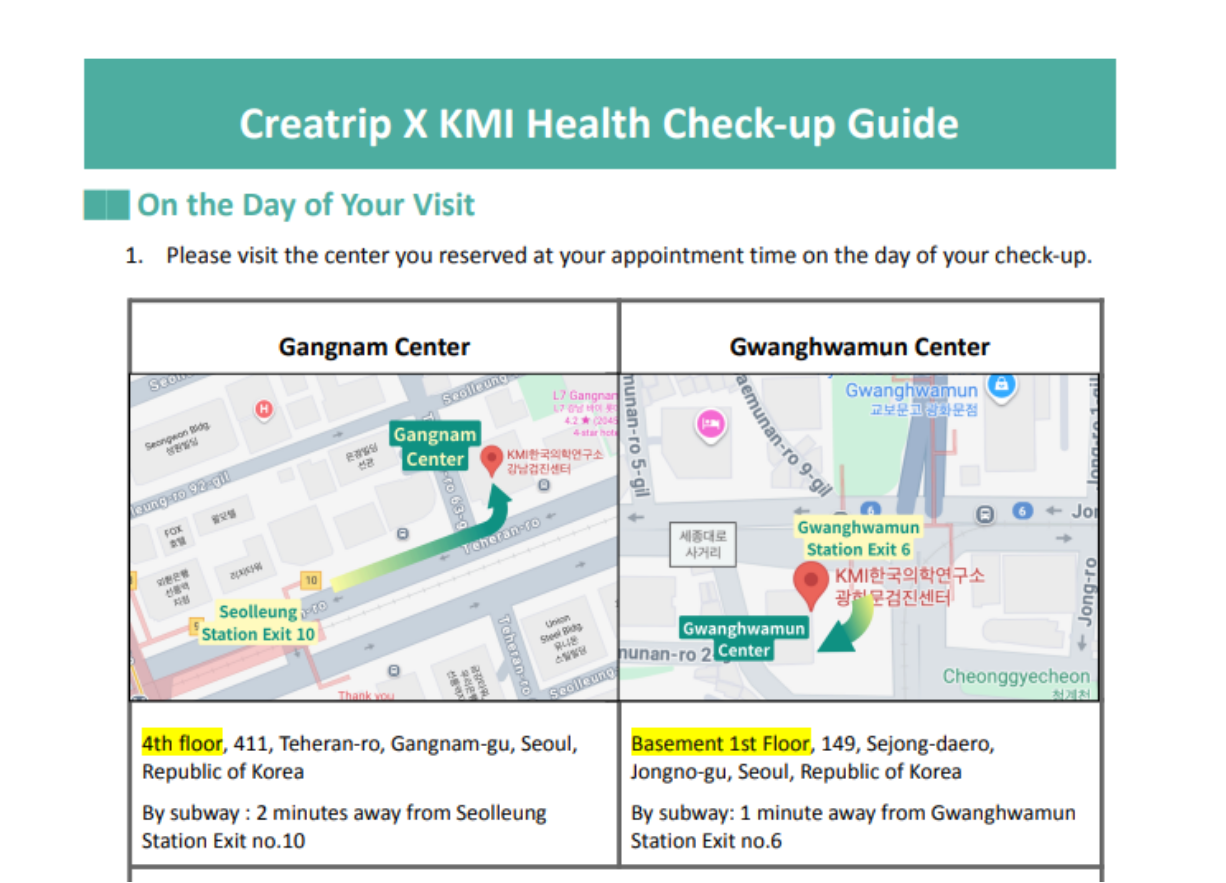 Nachdem ich diese Untersuchung selbst durchlaufen hatte, wollte ich wirklich, dass Ausländer eine hochwertige health screening in Korea ohne den üblichen Stress buchen können. Nach interner Abstimmung haben wir offiziell KMI health checkup Reservierungen auf Creatrip eröffnet.