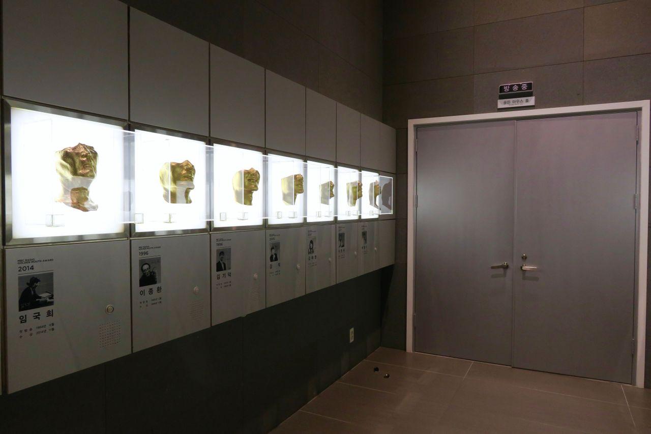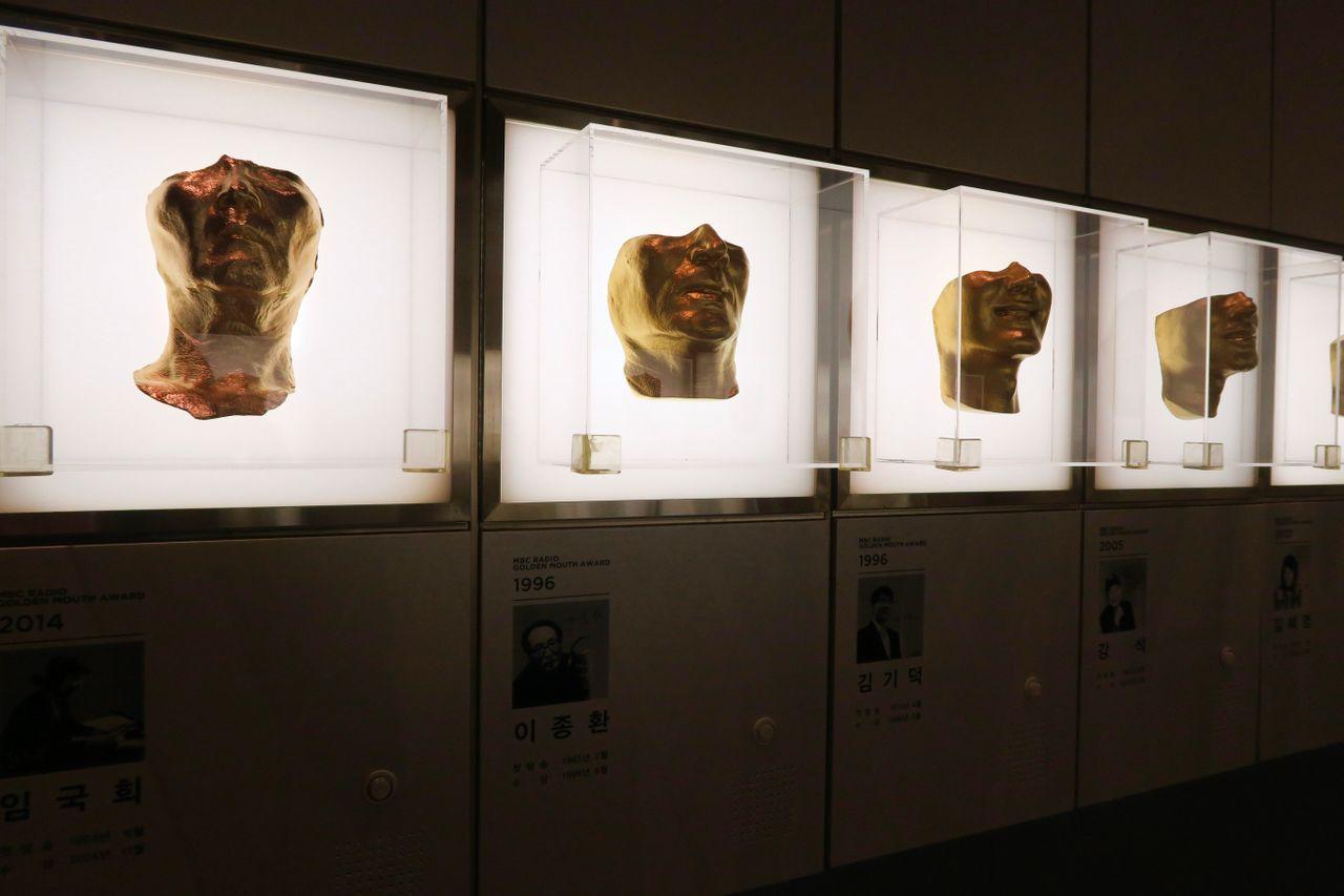 Wenn Sie an der Ruhmeshalle vorbeigehen, sehen Sie die goldenen Masken unter einem schwachen Licht. Zuerst konnte ich nicht herausfinden, was es war. Und als ich den Kommentar darunter las, war es so faszinierend. Diese Goldenen Mund-Statuen sind eine Darstellung der Münder von DJs, die stark zum MBC-Radio beitragen.