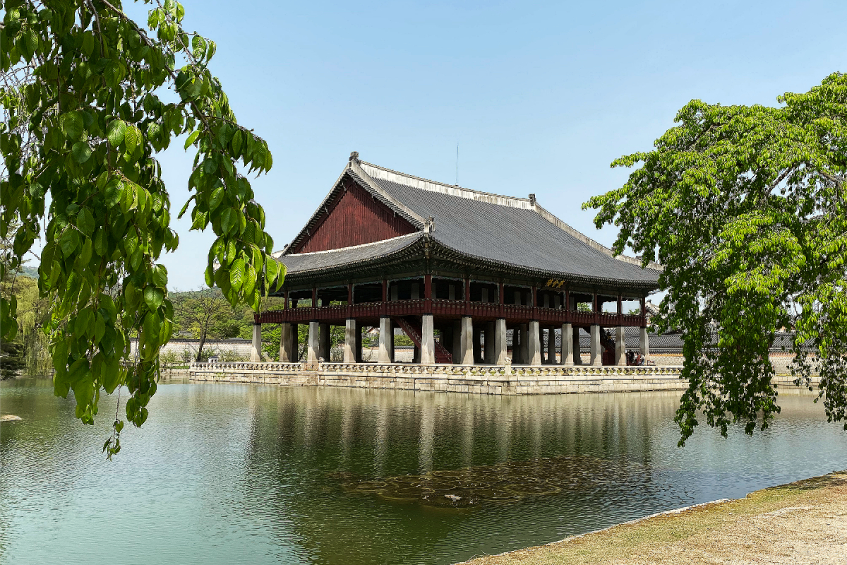 One of the most breathtaking areas we found was a small gazebo sitting in a lake connected by a bridge. We later learned it was called the Hyangwonjeong Pavilion. The water reflected the structure and paired so well with the blue sky that was shining over us. It was also in this moment we realized we could see Namsan from within the palace walls. People admired its beauty in many ways. From capturing it on camera, to relaxing with their loved ones on a bench to take in the view, it was clear that this area captured the attention of more than just us.