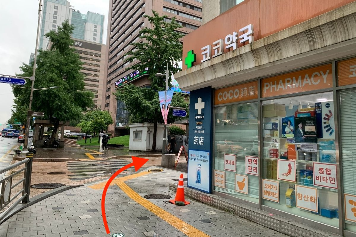 Turn right at the corner of the pharmacy.