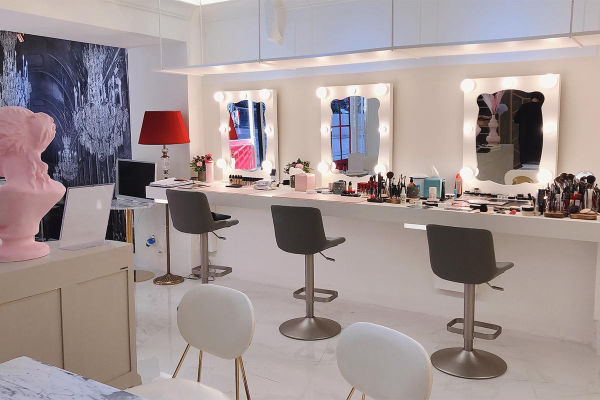 The moment you step into the salon, you'll be greeted by a bright environment with lights, mirrors, and salon chairs.