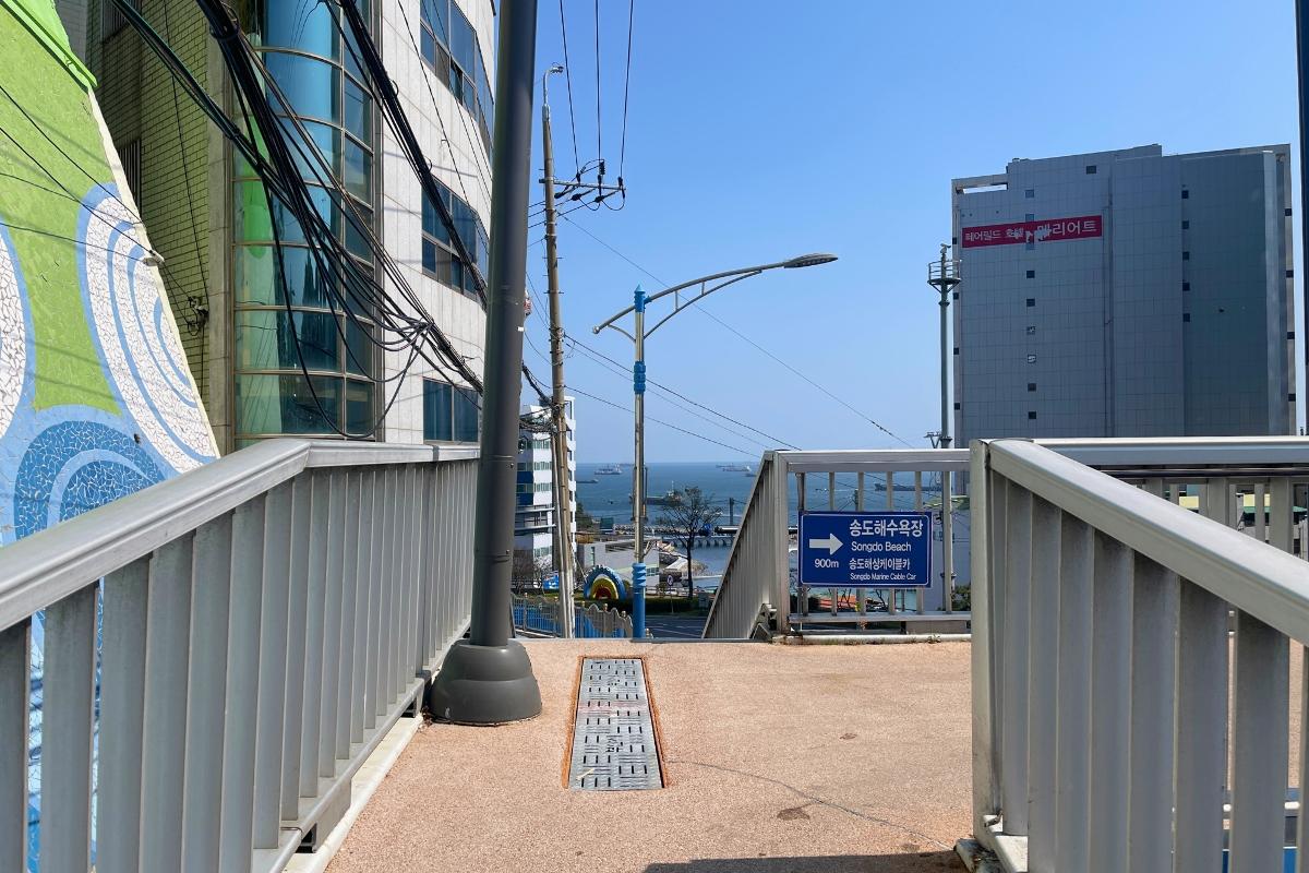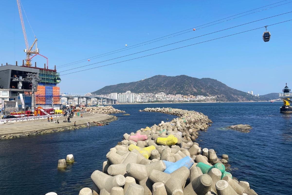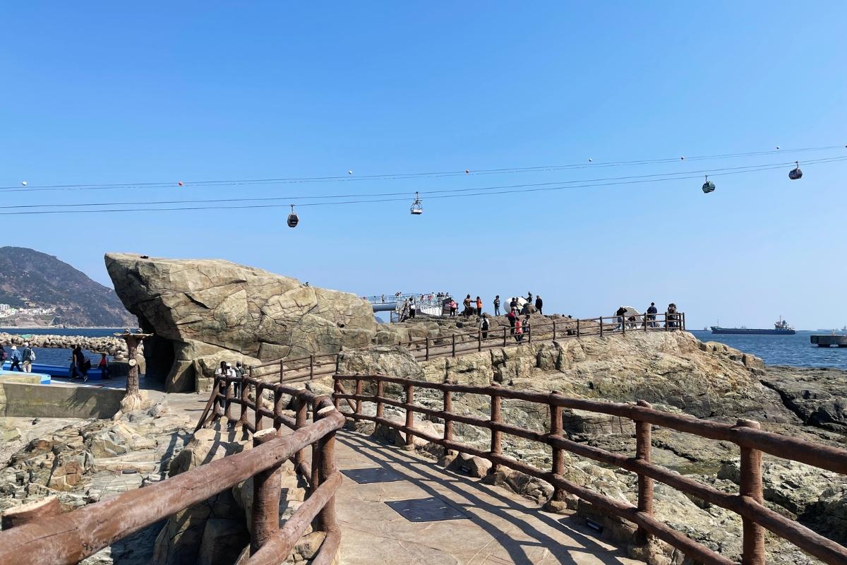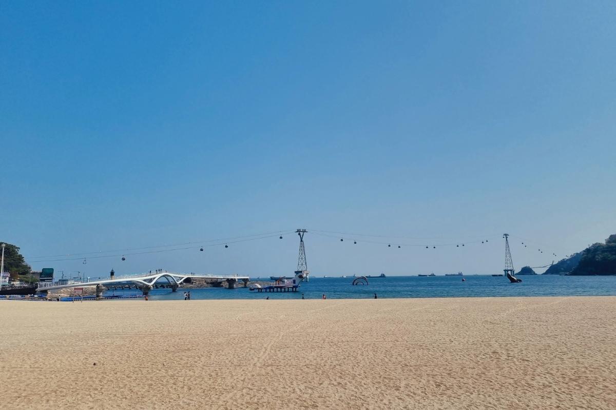 It's about a 5- to 10-minute walk to Songdo Beach. You'll see the cable car line and the Songdo Cloud Trails across the horizon along with high-rise buildings on the coast. Compared to Gwangalli Beach, Songdo has a more calm and quiet vibe.