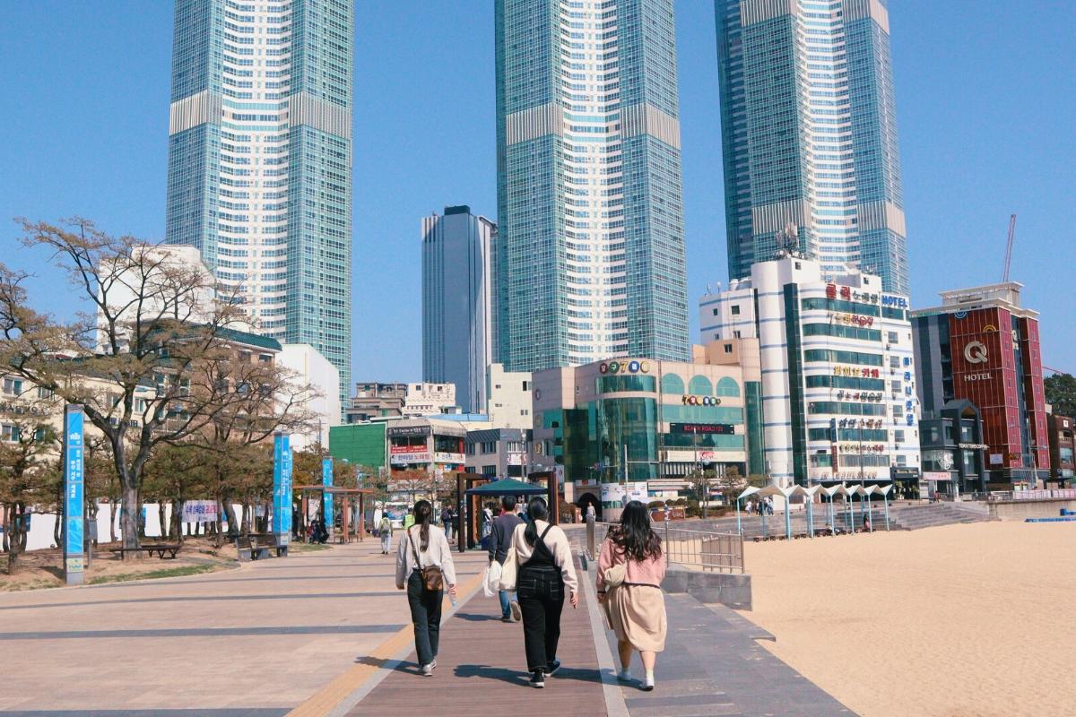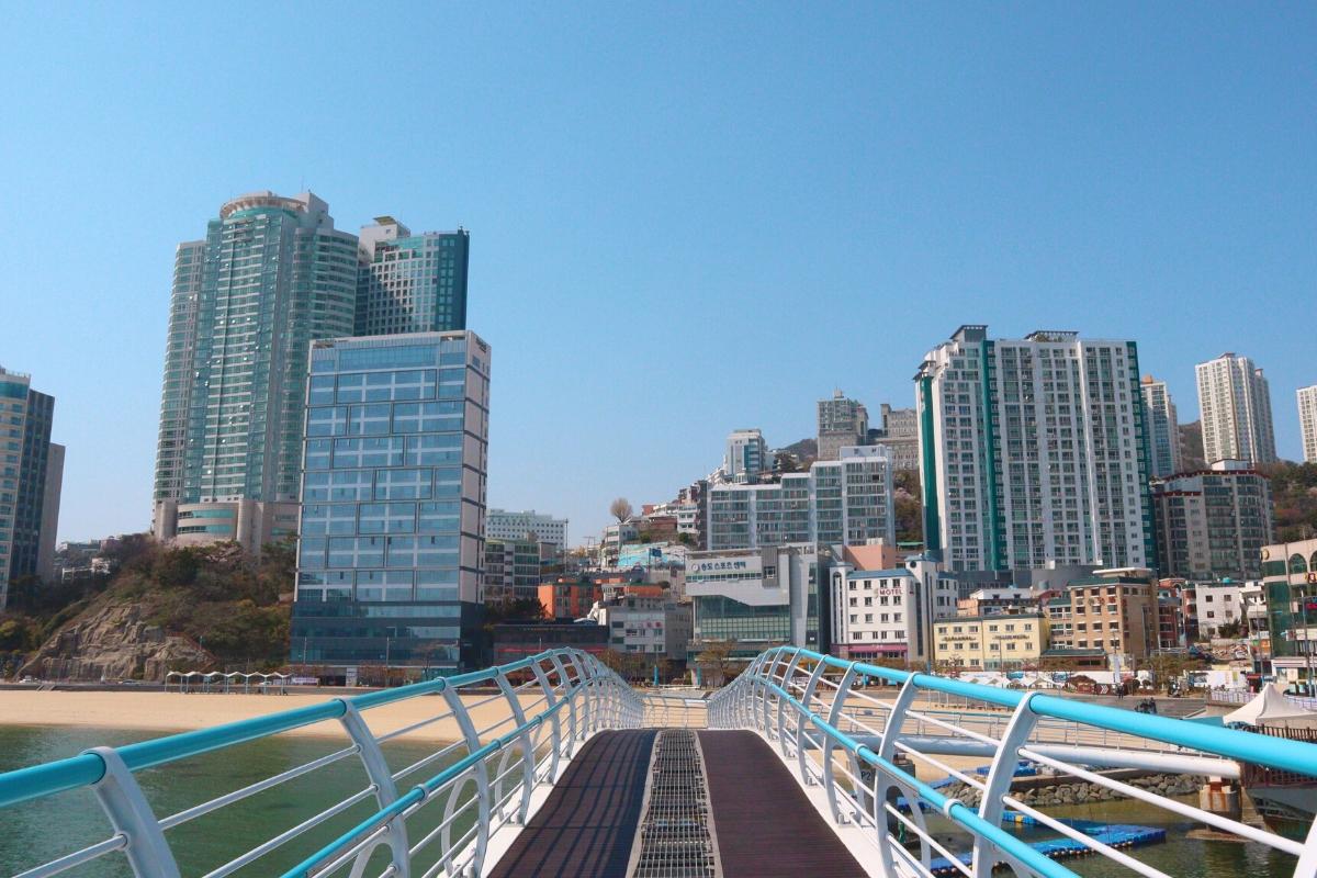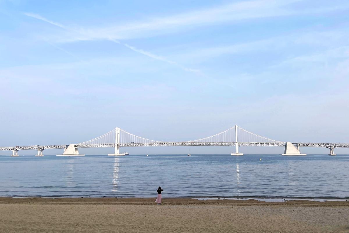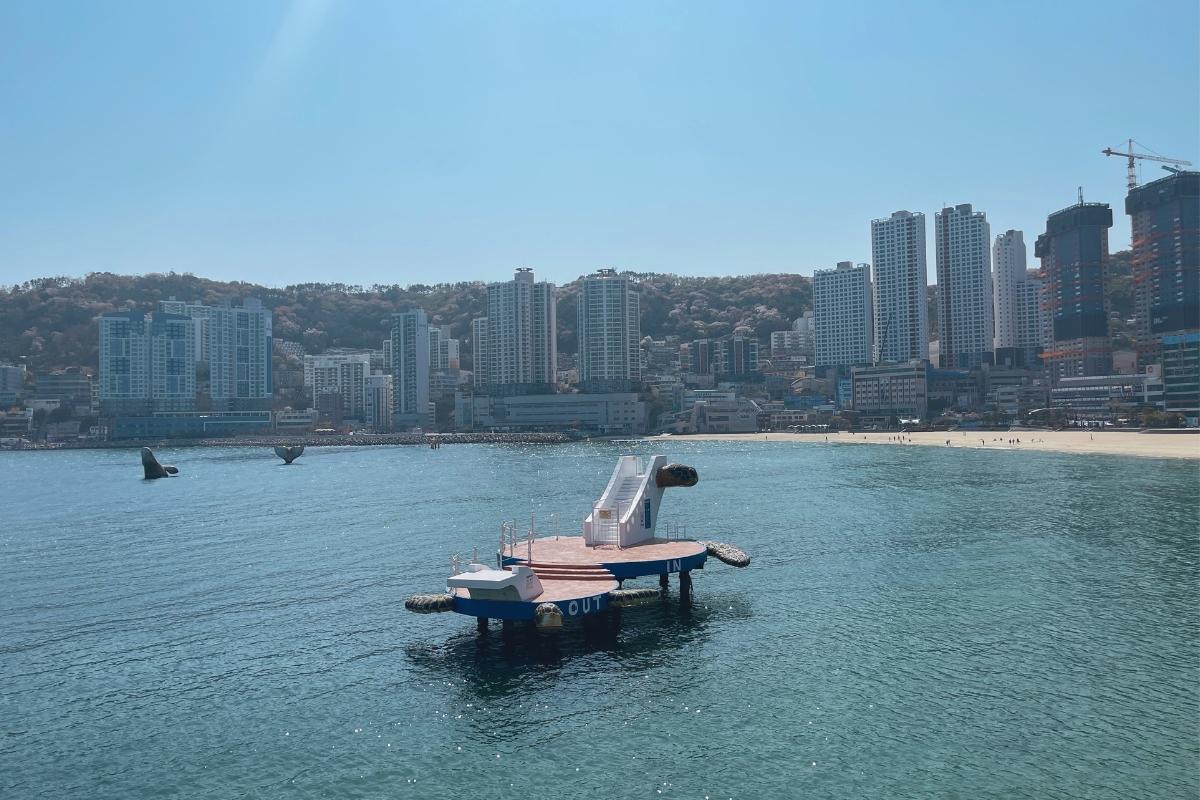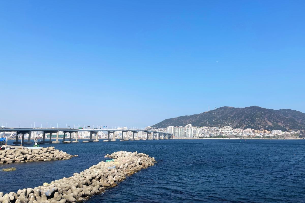 It's about a 5- to 10-minute walk to Songdo Beach. You'll see the cable car line and the Songdo Cloud Trails across the horizon along with high-rise buildings on the coast. Compared to Gwangalli Beach, Songdo has a more calm and quiet vibe.