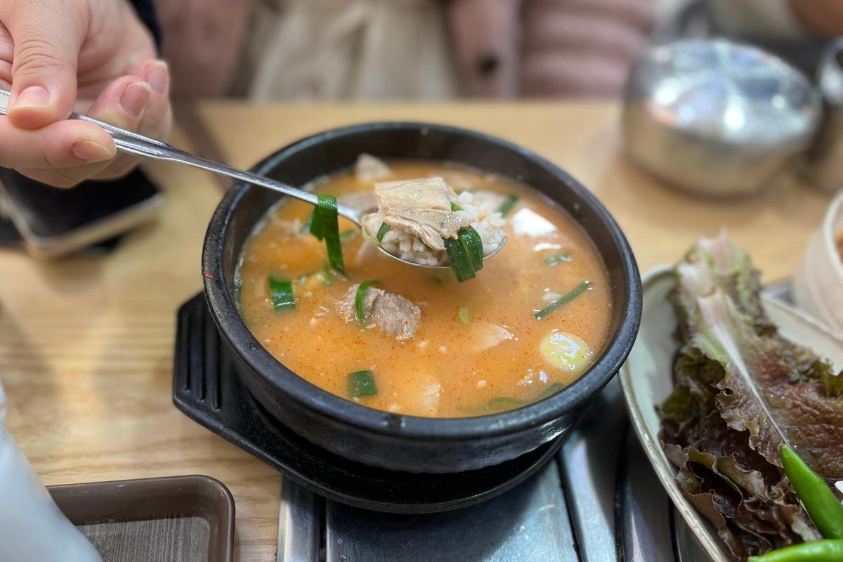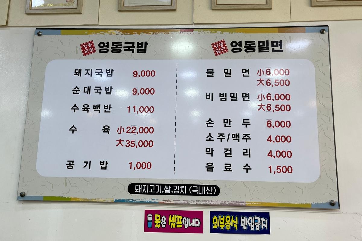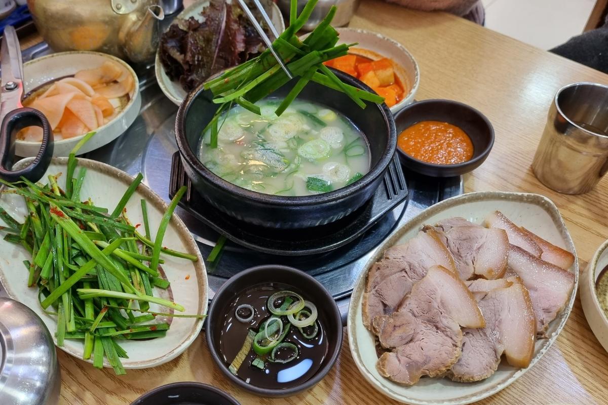 We ordered two Pork Rice Soups 돼지국밥 (9,000 KRW), one Suyuk Baekban 수육백반 (11,000 KRW), and one large Bibim Milmyeon 비빔밀면 (6,500 KRW). We shared this among 4 people and it was more than enough!