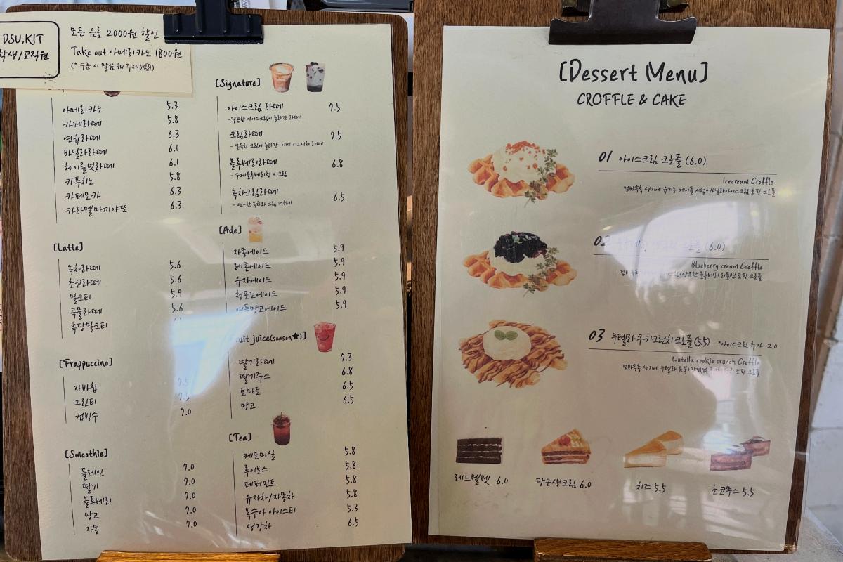 Cafe ITTI specializes in croffles and has a variety of drinks available. We ordered the Ice Cream Croffle 아이스크림 크로플 (6,000 KRW), Green Tea Cream Latte 녹차크림라떼 (6,500 KRW), and the Apple Mango Ade 애플망고에이드 (5,900 KRW).