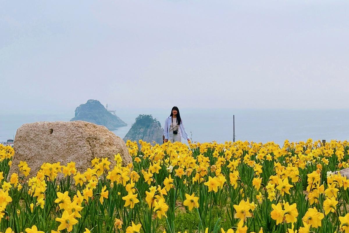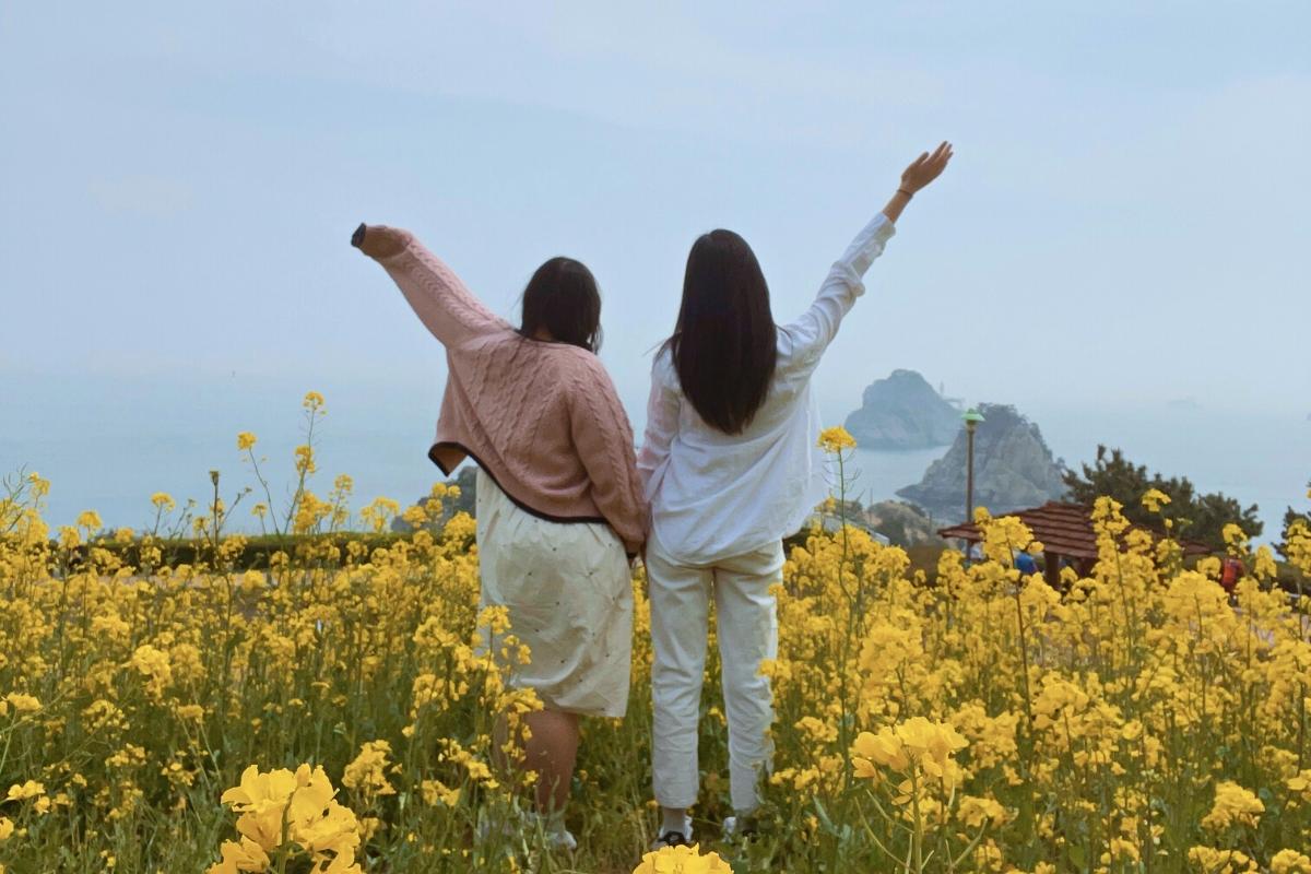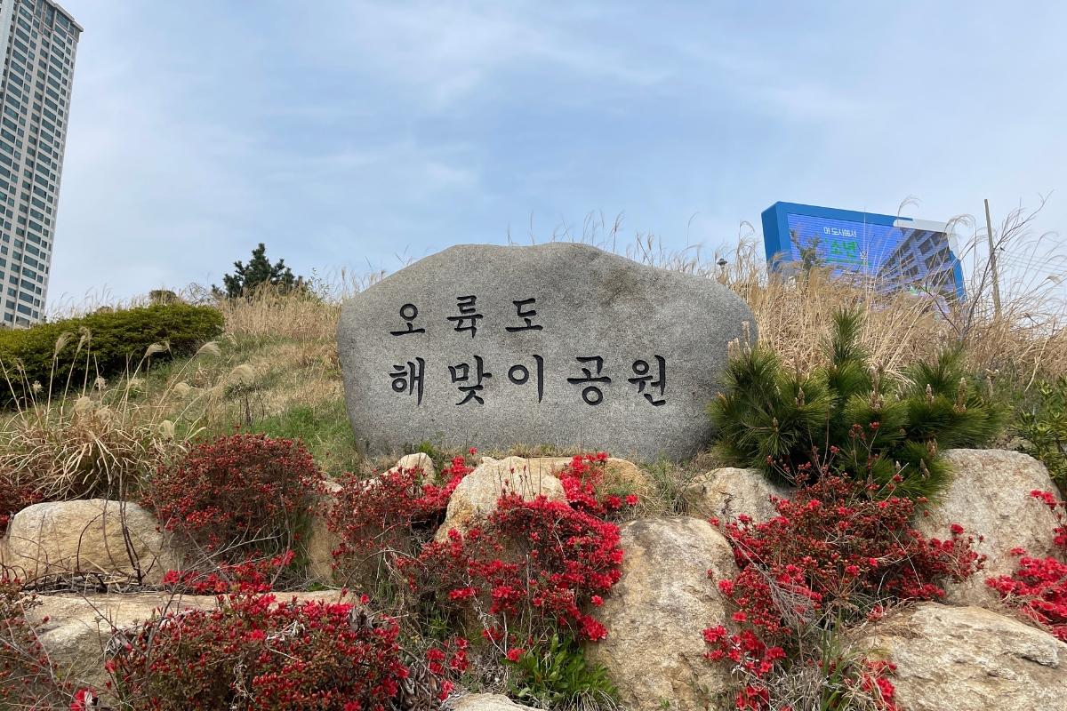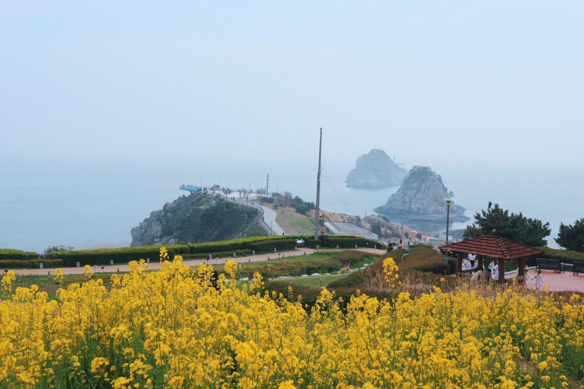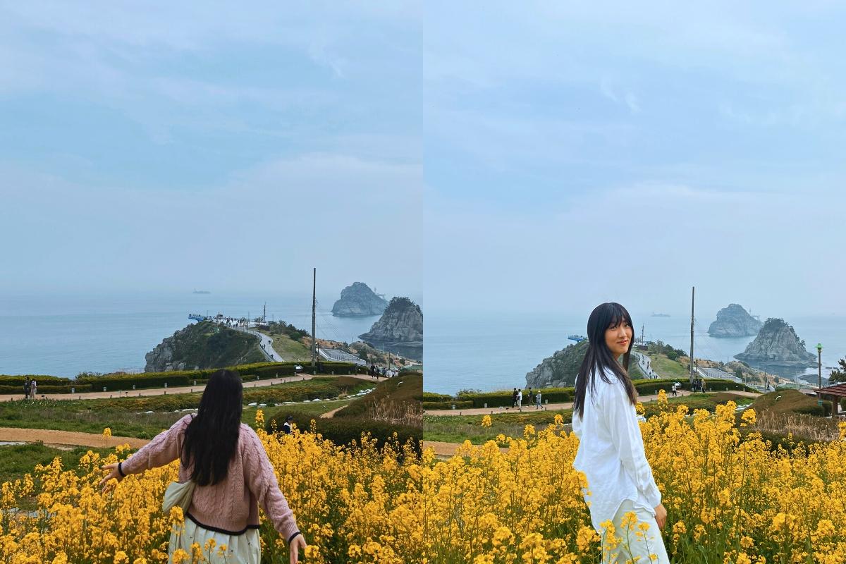 Oryukdo Park is a very popular spot to visit during the spring because of the beautiful canola flowers, or 유채꽃! Their vibrant yellow colors make a beautiful background along with the blue coastline.