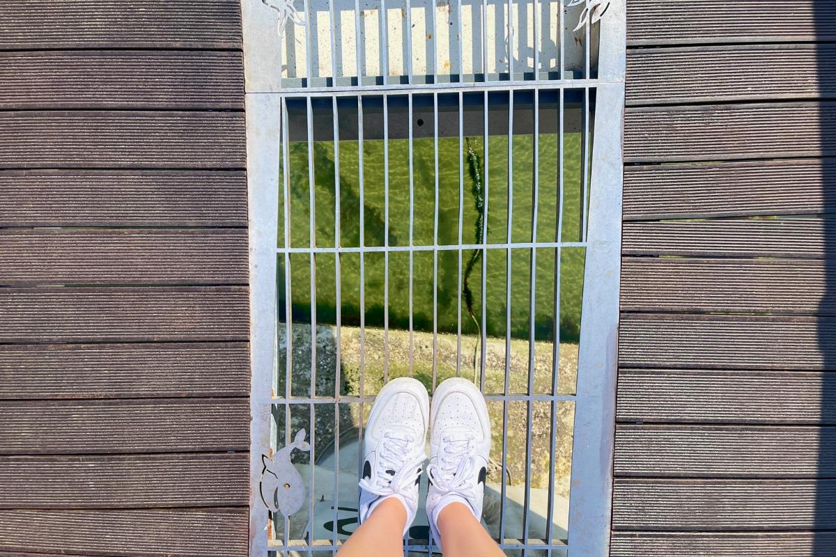 There are parts along the deck of the trail where you can see through to the water. There isn't any glass blocking these areas, so be careful not to drop your phone or other belongings!