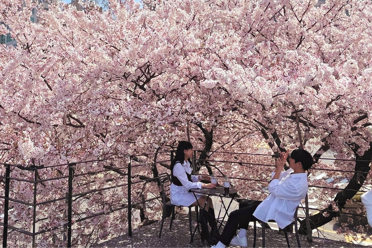 Since the rooftop has an amazing view of the cherry blossoms, it's the most sought-out spot for seats. It may be hard to get a spot, but it's worth a try seeing how nice it is! Keep in mind that the photo zone can only be used if paid for. For the best view of cherry blossoms, this is a great spot! For more cherry blossom view cafes, check out our blog in the link below: