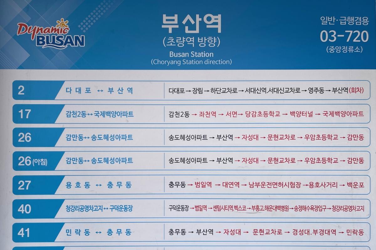 Finally, it's time to head back to Seoul. You can walk about 10 minutes to Annam-dong Community Center Bus Stop and take Bus 26 to Busan Station Bus Stop. It's about a 20-minute bus ride.