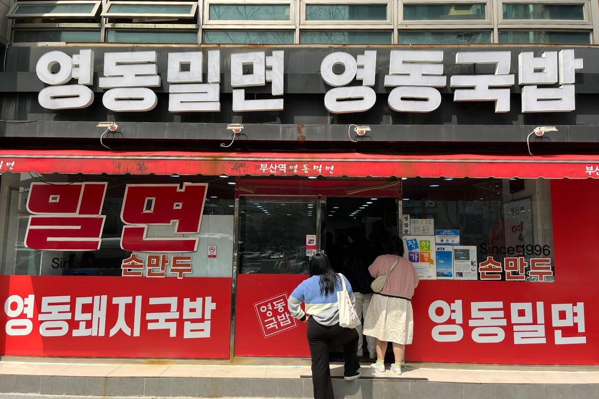 After a 3-hour train ride, you're going to be hungry! Luckily, there are many restaurants located just outside the station (and even in the station). We went to Yeongdong Milmyeon, which is a popular Korean restaurant that sells Busan's most iconic dishes, Pork Rice Soup (돼지국밥) and Cold Noodles (밀면).