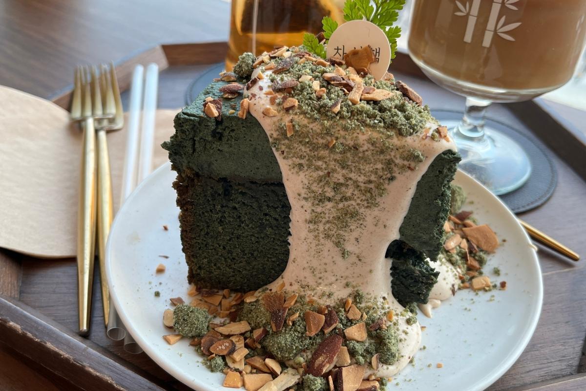 Not only does this cafe have an amazing view, but it also has delicious desserts and drinks. We ordered the Mugwort Gateau 쑥갸또 (7,500 KRW), an iced Injeolmi Latte 인절미라때 (7,500 KRW), and an iced Wedding Imperial Tea 웨딩 임페리얼 홍차 (6,500 KRW).