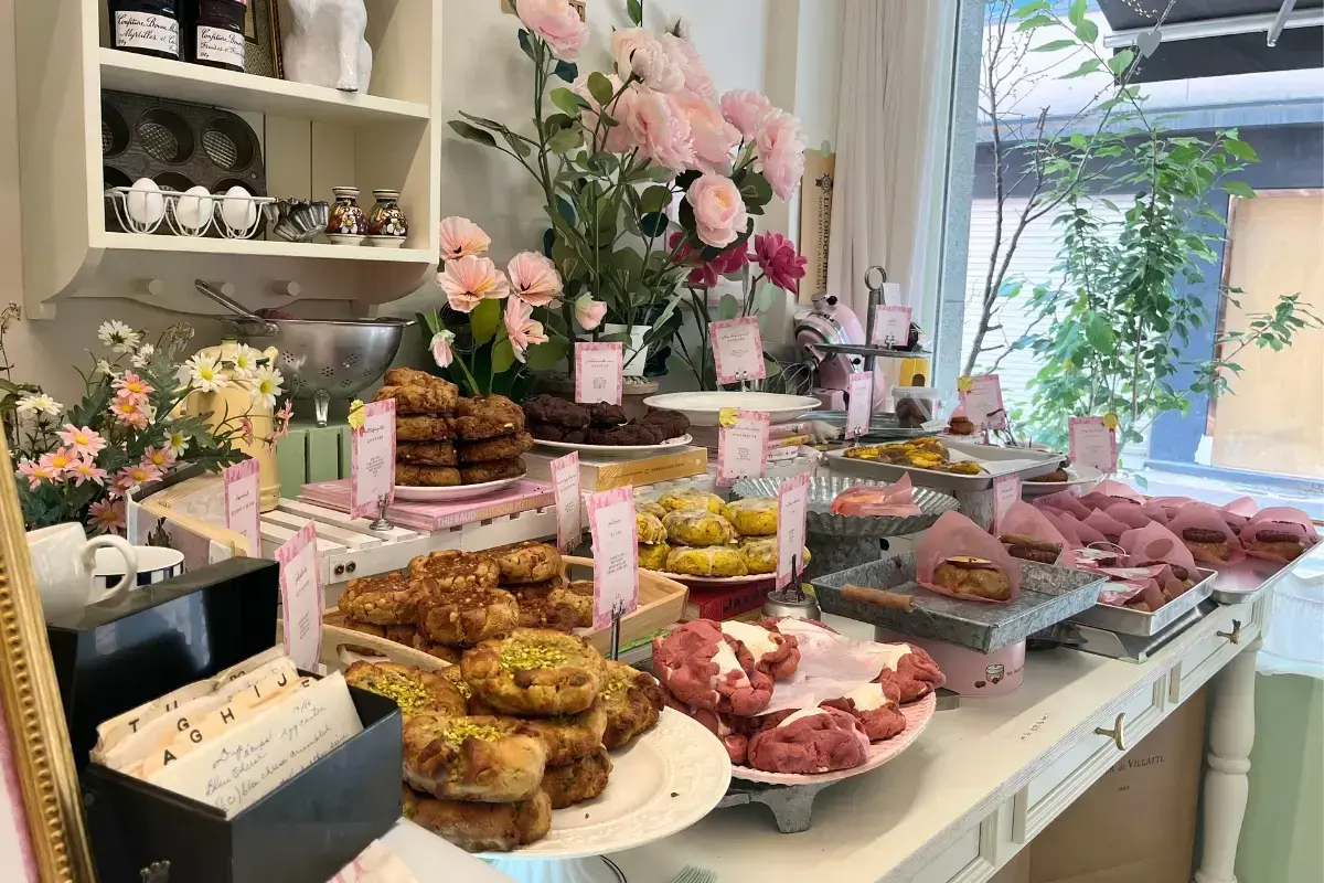 The shop is designed in a French style, with pastel greens and pinks decorating the interior. All the cookies are laid out for customers to see and choose!