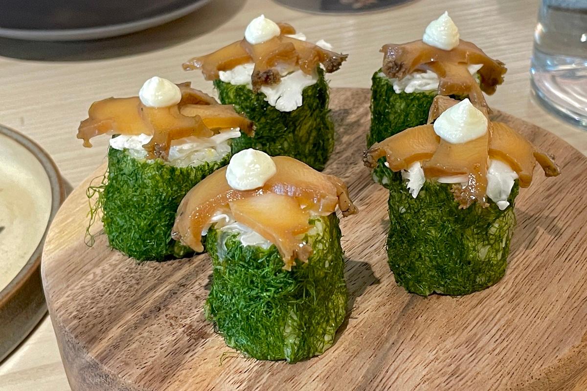 'Abalone Janggimchi Kimbap' is a dish where rice is wrapped with salty and savory gamtae (dried kelp) and filled with mukeunji (aged kimchi) and abalone sauce. Abalone itself is delicious, but to make it into a kimbap with mukeunji and gamtae was an interesting combination! When I tasted it, I was even more enchanted. The seasoning was just right, and the quality of the ingredients made me feel healthier.