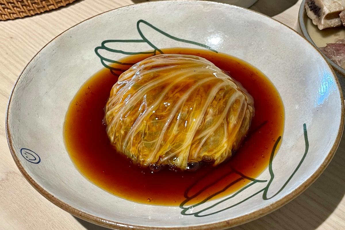 This is On 6.5's signature dish, the 'Baechu Ssam' (cabbage wrap). It was beautifully presented on a plate, resembling a hand-wrapped shape. This menu features cabbage wraps filled with gochujang kimchi, doraji kimchi, and a combination of pork and beef, all cooked with red wine.