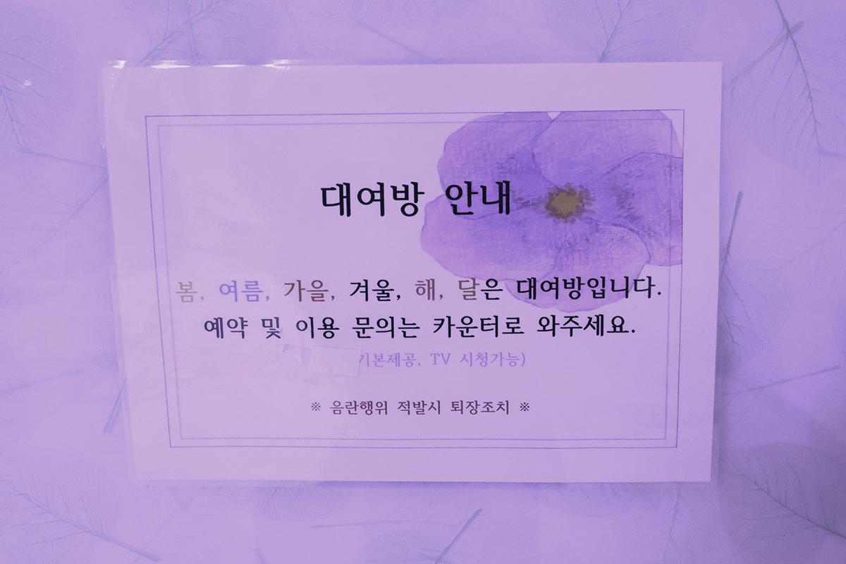 One of the other features of Hongdae 24-hour Sauna is that there are rental rooms available. The rooms are divided into four rooms according to the names of the four seasons, from the spring room to the winter room, they are located side by side. If you want to use the rental room, you need to talk to the front desk and make a payment on-site!