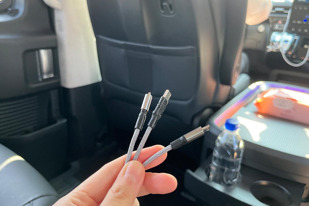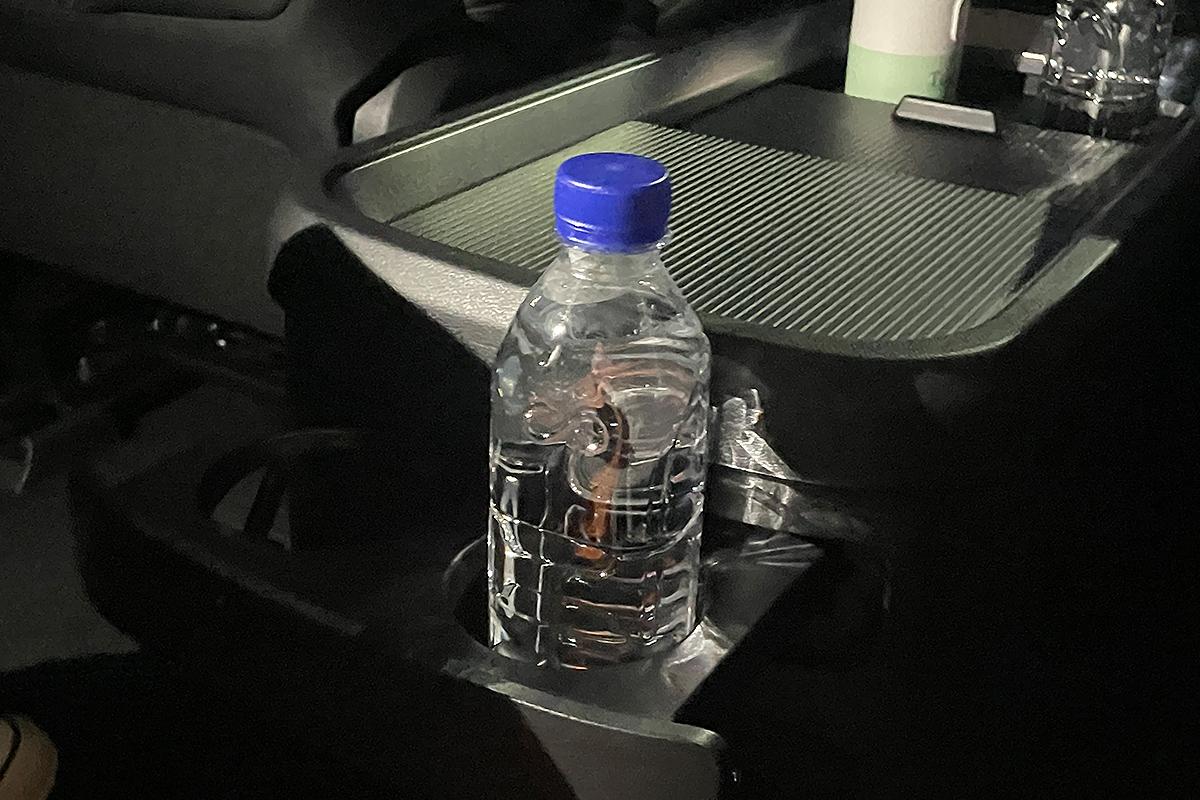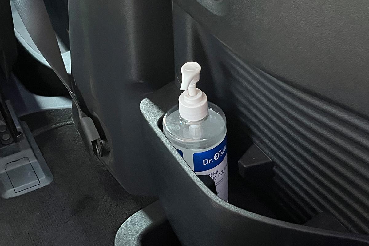 The car has a mobile phone charger, a bottle of water, and hand sanitizer. It was nice to be able to charge my phone and quench my thirst while traveling!