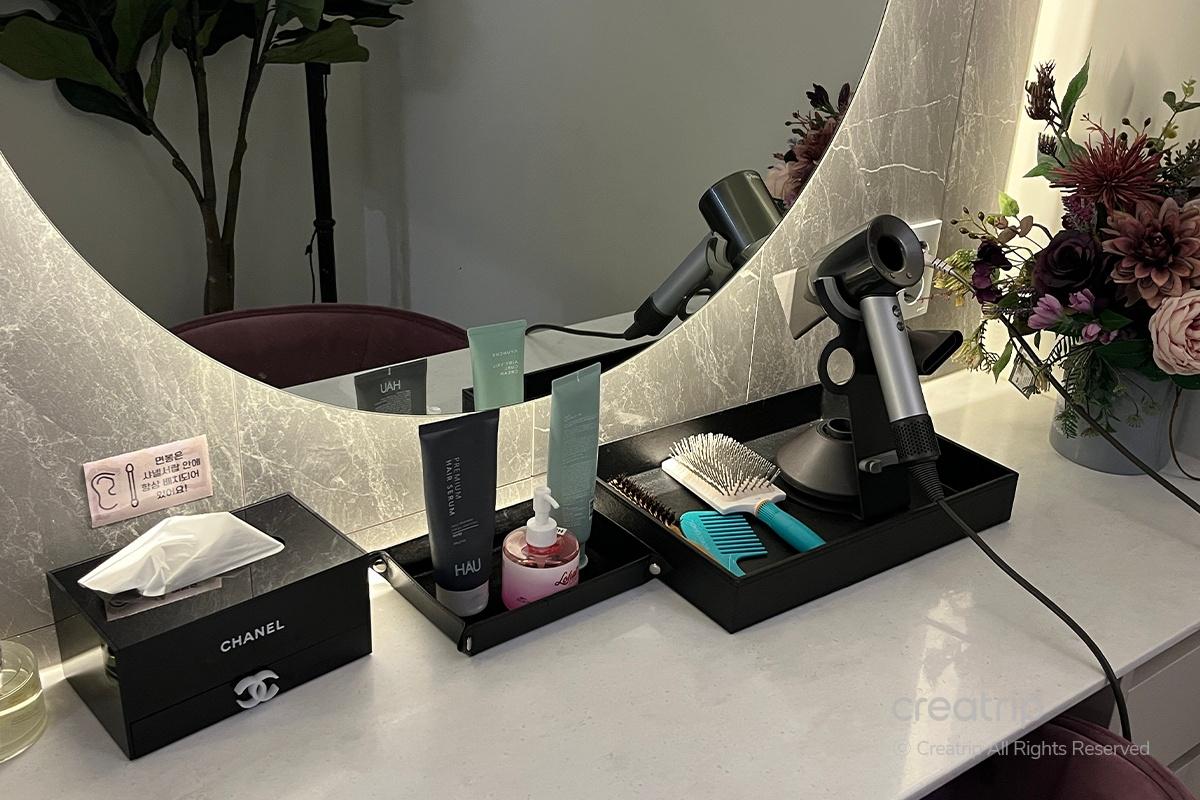 After wrapping up the entire process, you can head to the powder room, which is equipped with hair oils, combs, cotton swabs, and even the famous Dyson hair dryer!