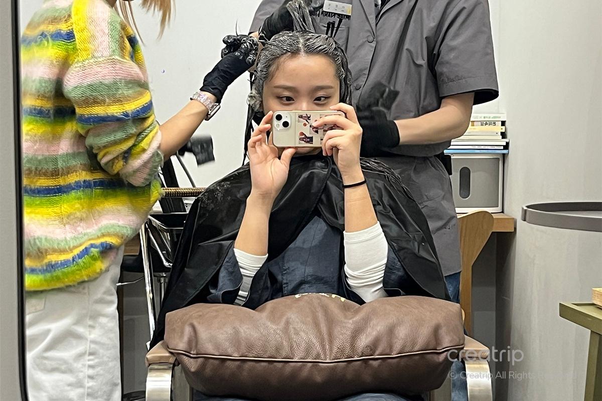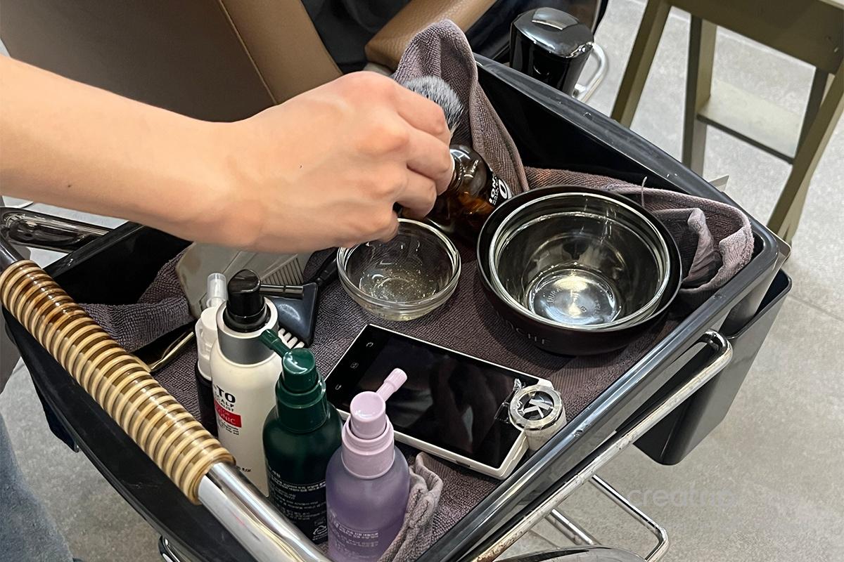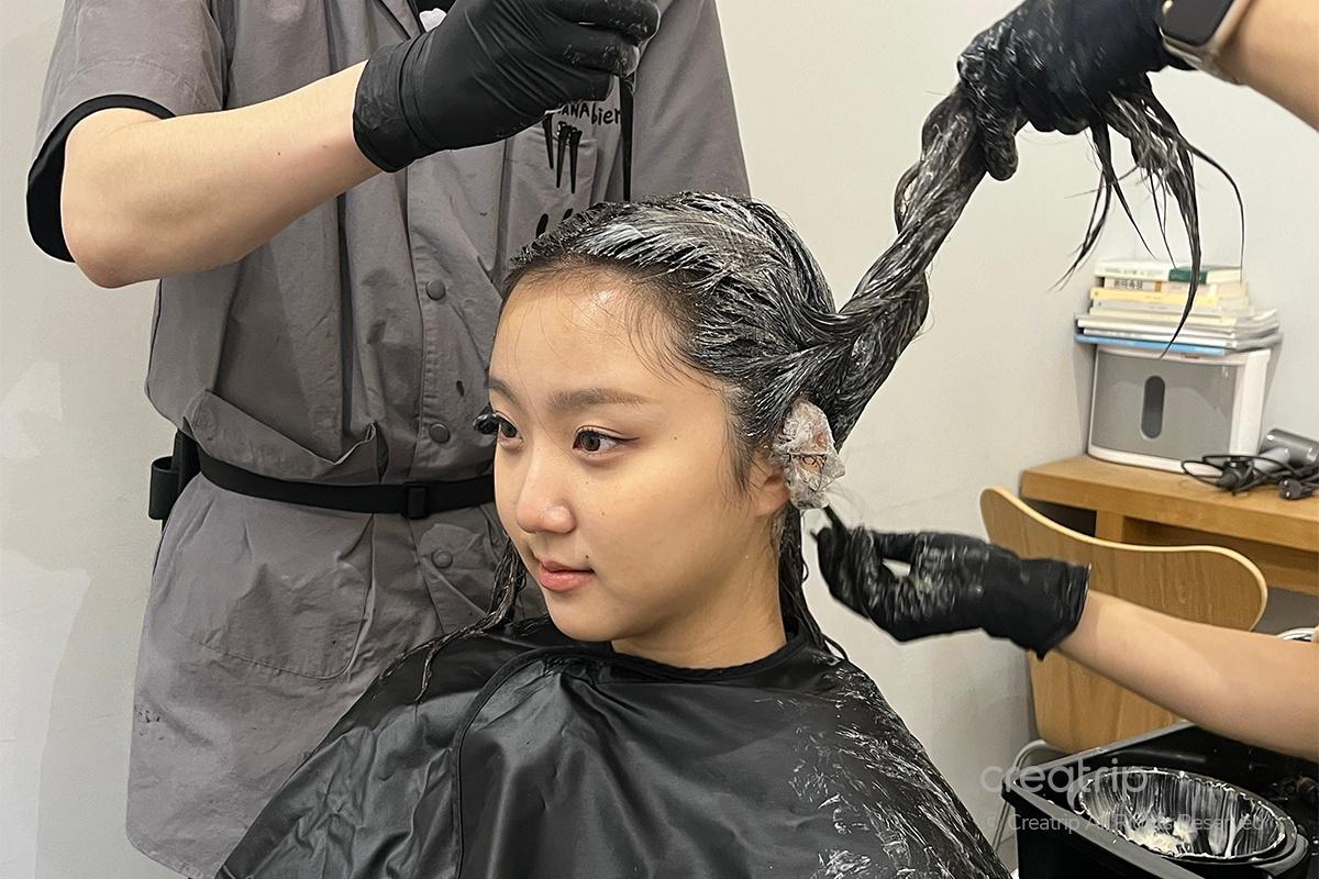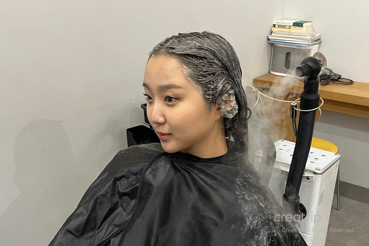 After completing all the pre-treatment consultations, they've started the treatment process. First, a scalp protector was applied to the scalp before dyeing.