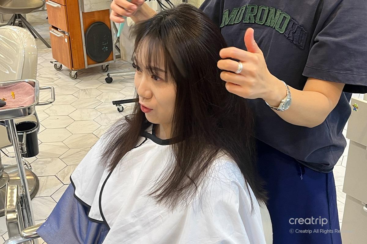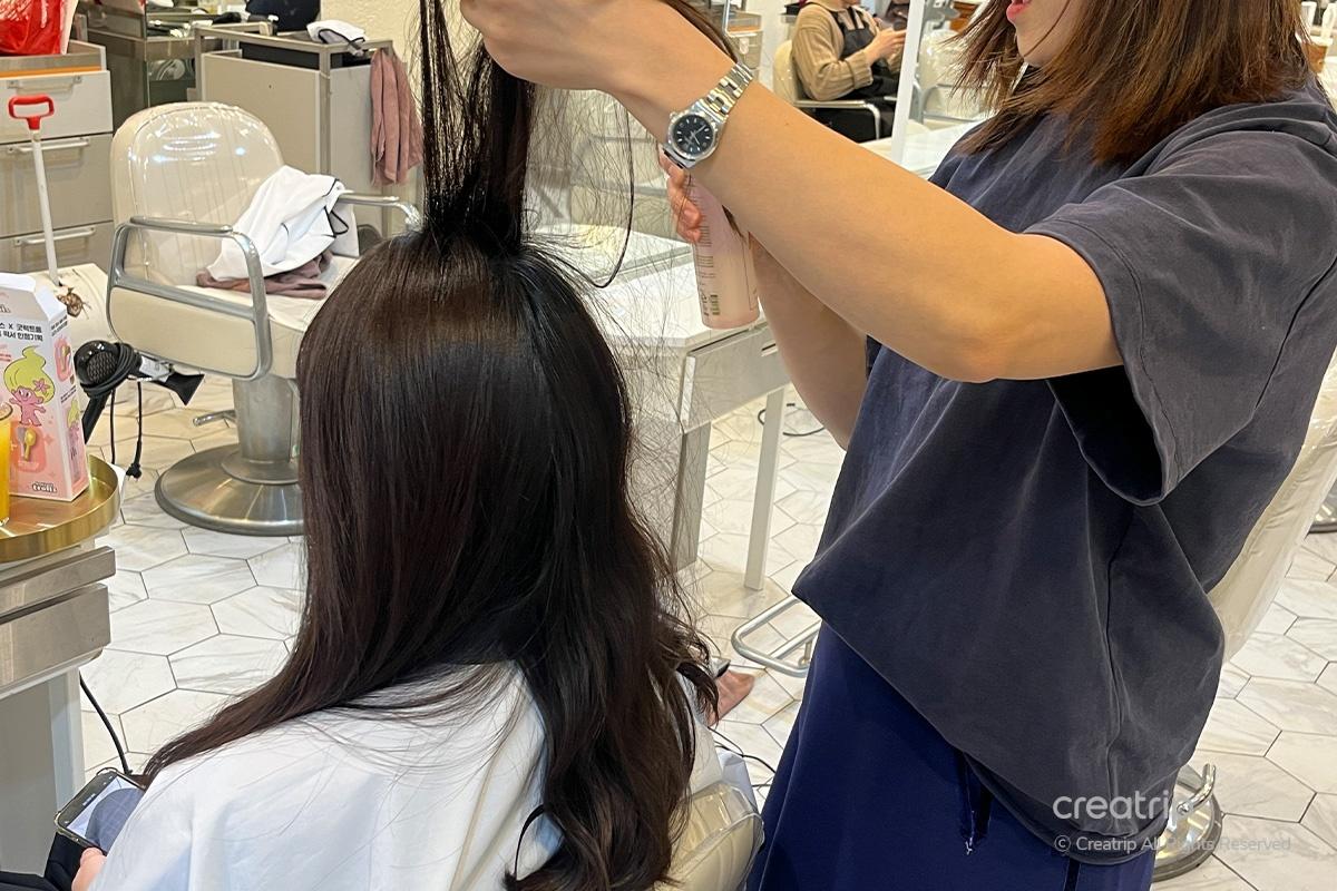 After makeup, we headed to the 3rd floor for hairstyling. After showing our desired hair styles, they continued with shampooing, drying, and styling with a hair straightener. The editor, having received a head spa, skipped the shampooing and drying steps.