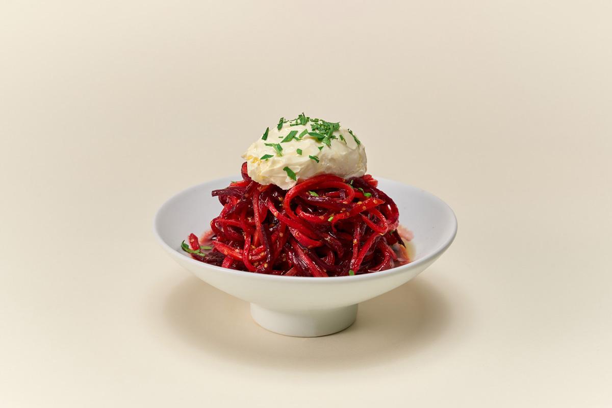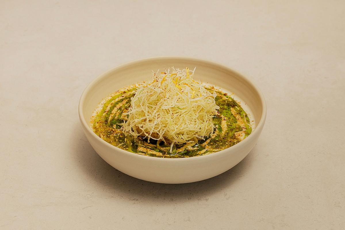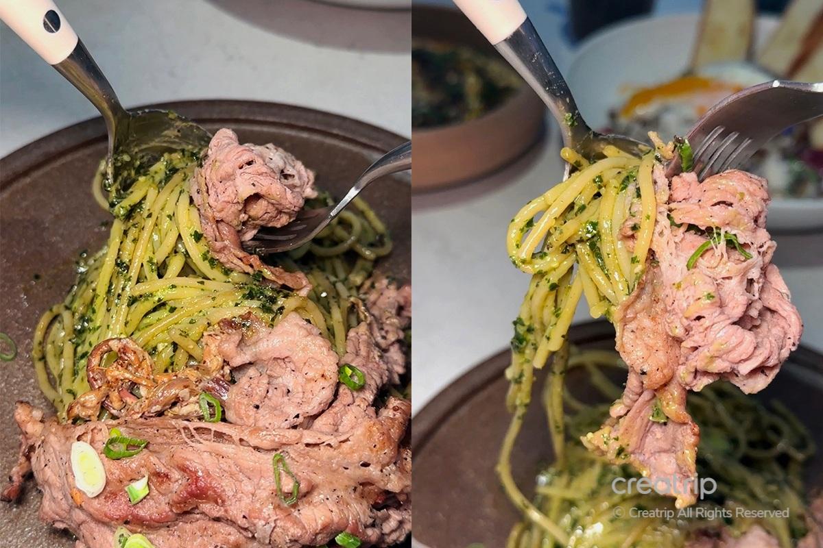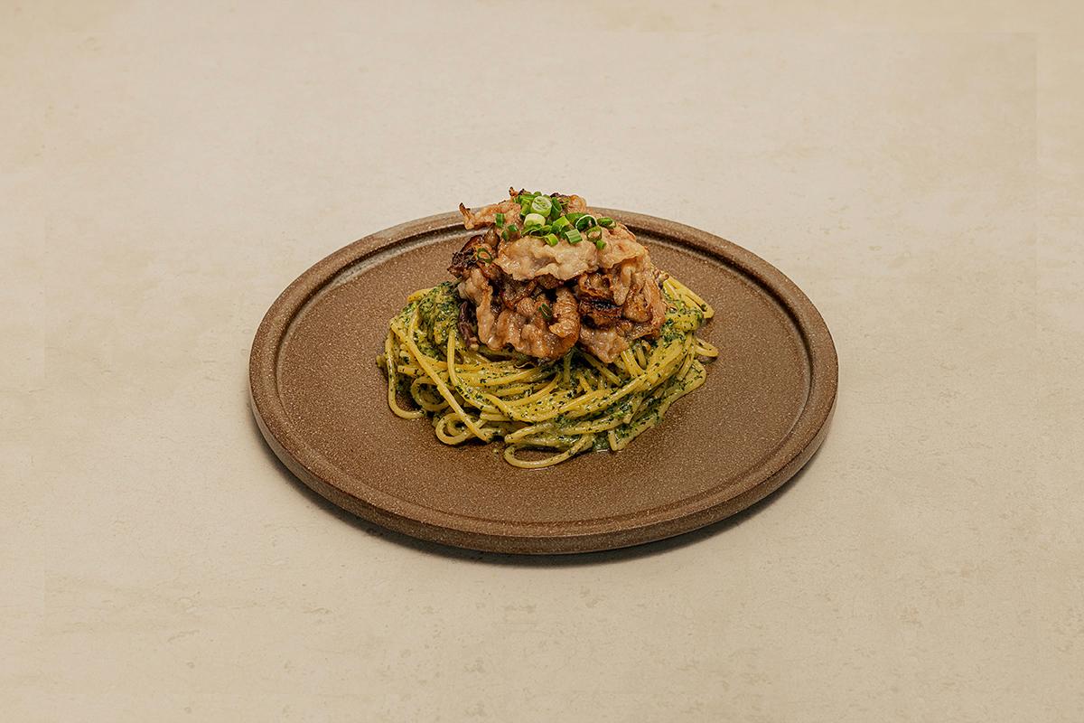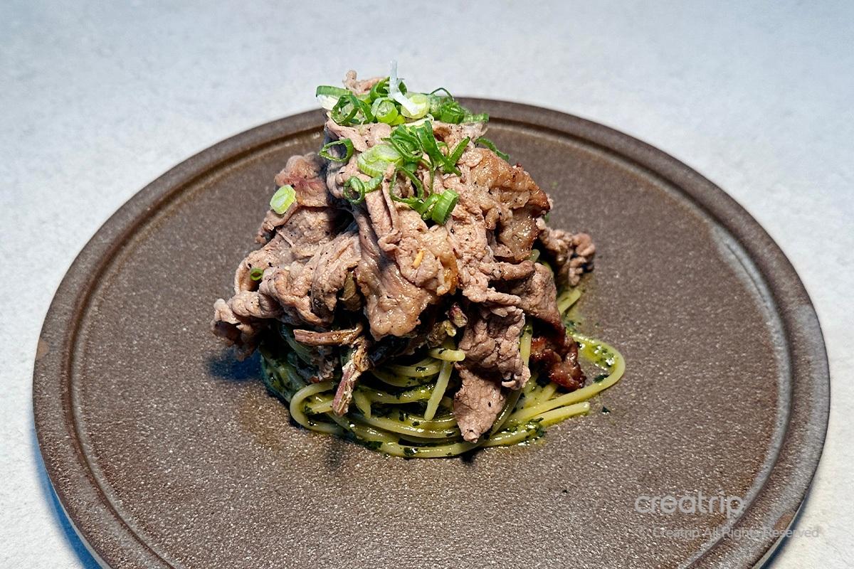 The Brisket Bracken Pasta features spaghetti, perilla leaf pesto, bracken, and brisket, offering a blend of tender bracken and savory brisket with a deep, aromatic flavor from the perilla and sesame oil.