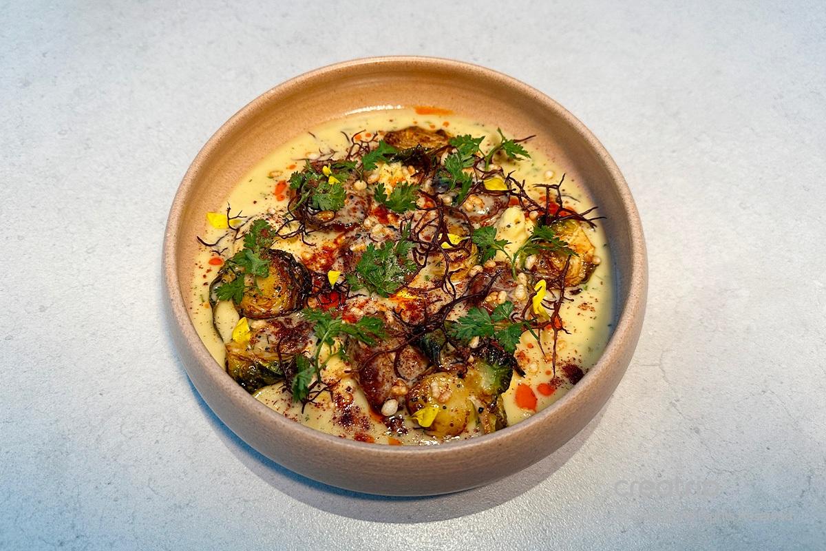 The Grilled Scallops, a dinner-exclusive dish, consists of scallops, mini cabbage, ponzu blanc, corn & cauliflower purée, and shrimp oil. The moist scallops, generously topped with the sweet and nutty purée, melt delightfully in your mouth, while the well-roasted mini cabbage adds an extra sweetness!