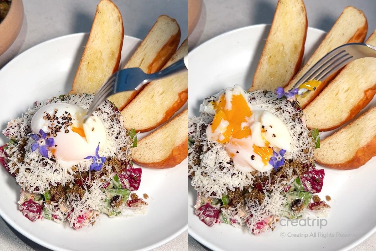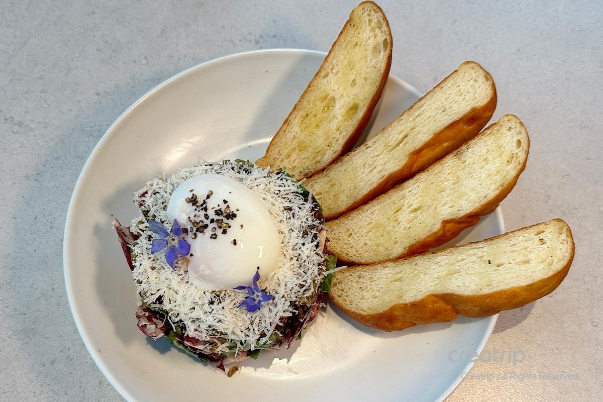We started with the Anchovy & Romaine Salad, featuring romaine, anchovy dressing, fried anchovies, a sous vide egg, and flatbread. Mixing the creamy egg with the salad and flatbread offered a delightful combination of flavors.