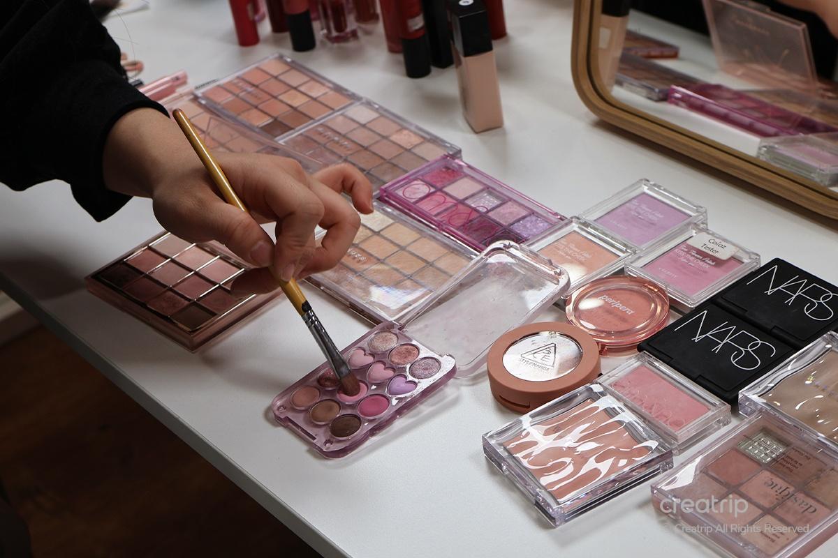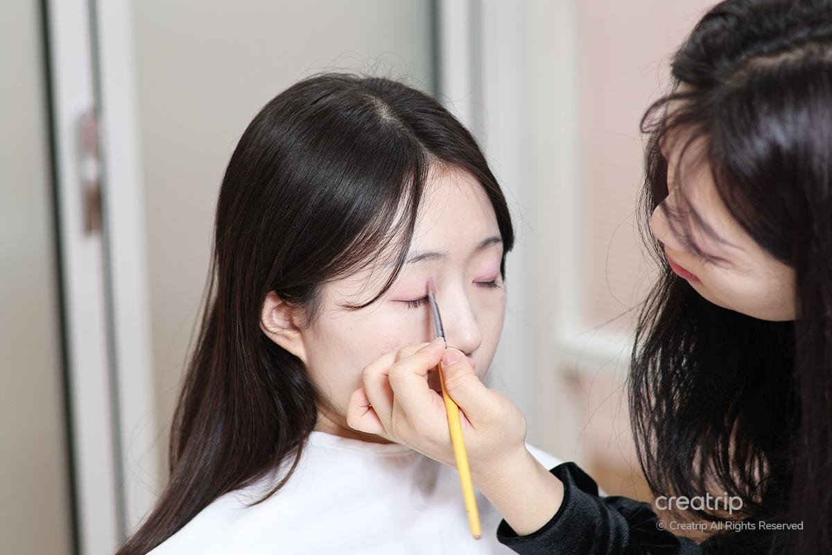 Next, they applied a bright pink-toned eyeshadow suitable for Summer Cool Light tones on the eyes. For shading, a deeper, reddish tone of eyeshadow was used to create a more profound look.