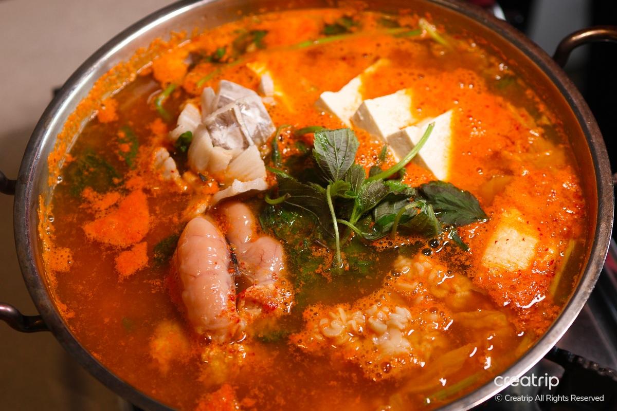 When eating seafood in Korea, locals always finish with a spicy soup called 매운탕! Inside there are plenty of eels, squid, tofu, eggs, vegetables, etc.