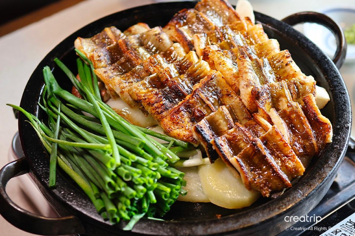 The menu is made with fresh wild eels directly delivered from the sea in Tongyeong, South Korea. Under the eel, enoki mushrooms and onions are laid, and chives are also available on the side, so you can enjoy them together deliciously.
