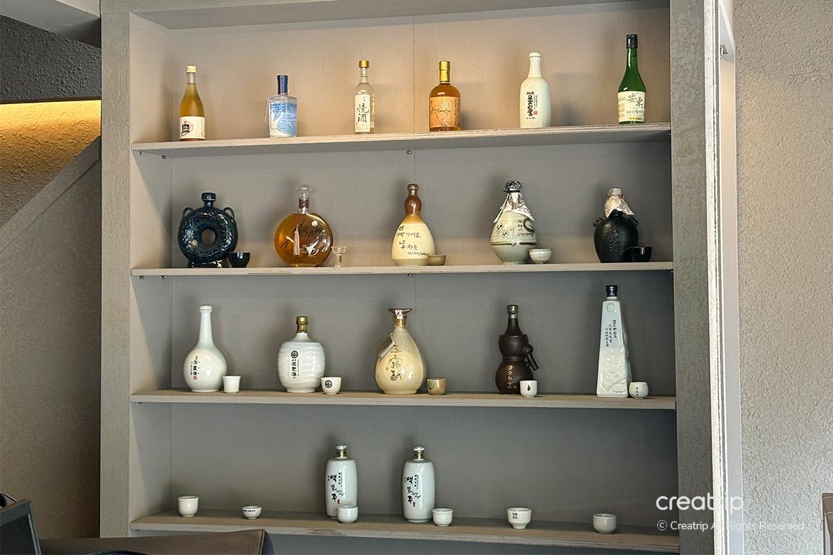 Upon entering the restaurant with a beautiful exterior, you can see shelves displaying a variety of traditional Korean alcoholic beverages.