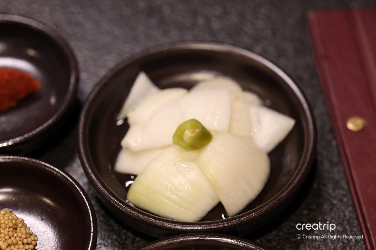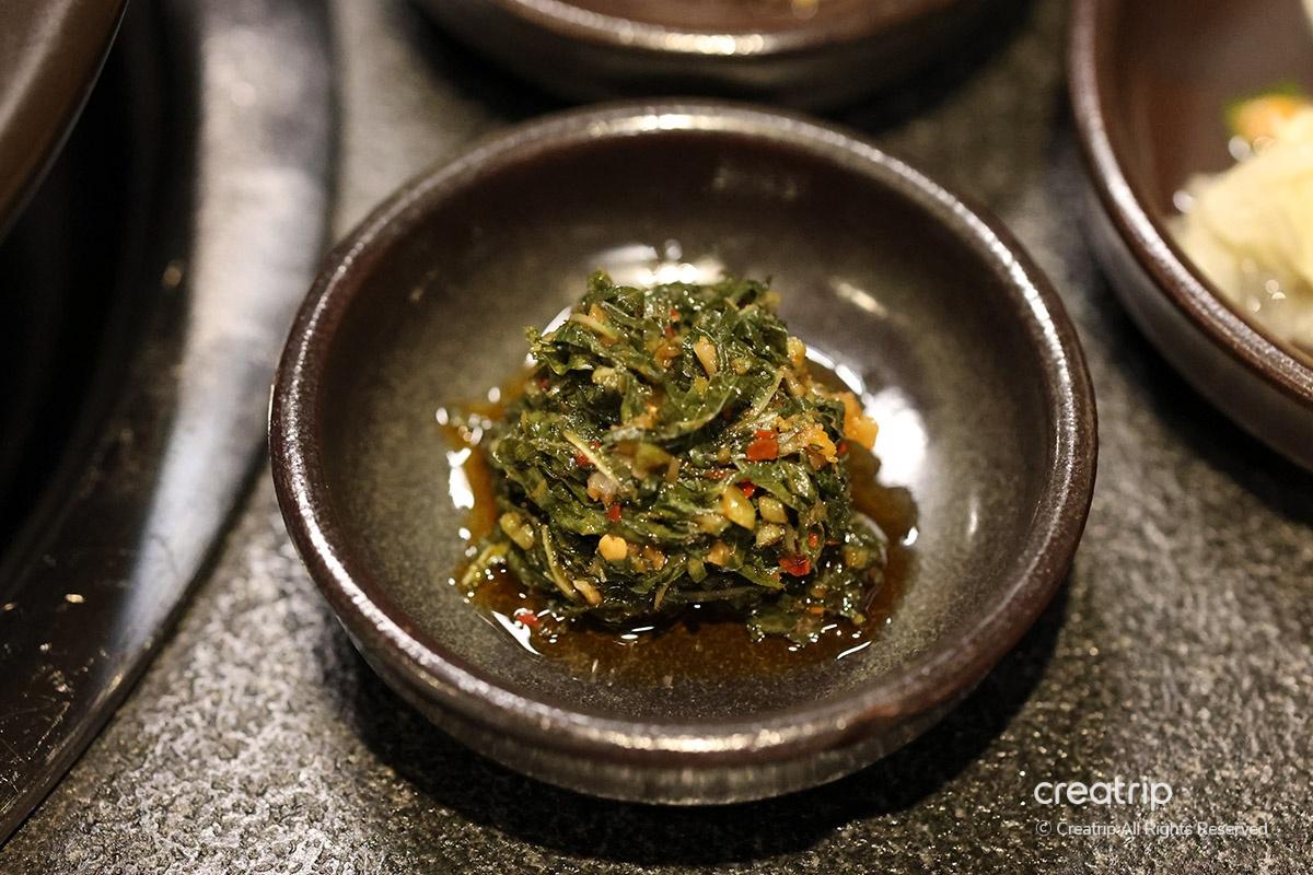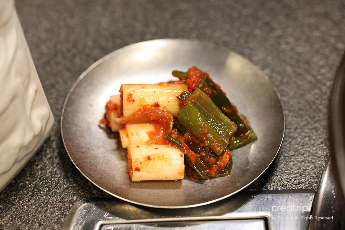 Another side dish, green onion kimchi, can be placed on the grill and cooked with meat to enhance the flavor even more.