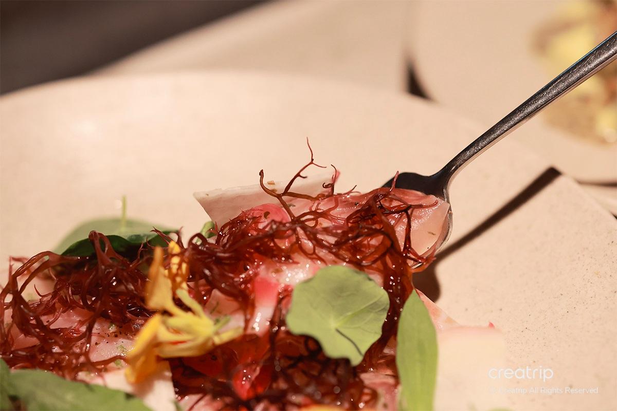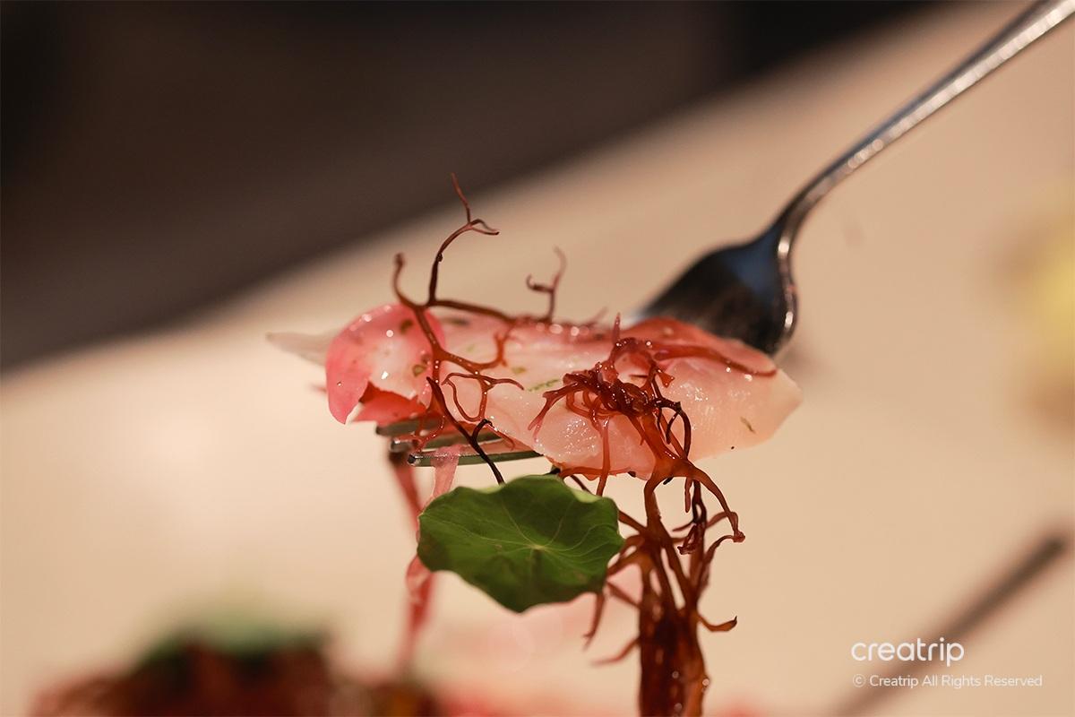The Jeju fish ceviche is made with fish caught off Jeju Island, and the fish used in the dish is always seasonal. It includes pickled red onions, pickled seaweed, and various types of radishes that change with the season.