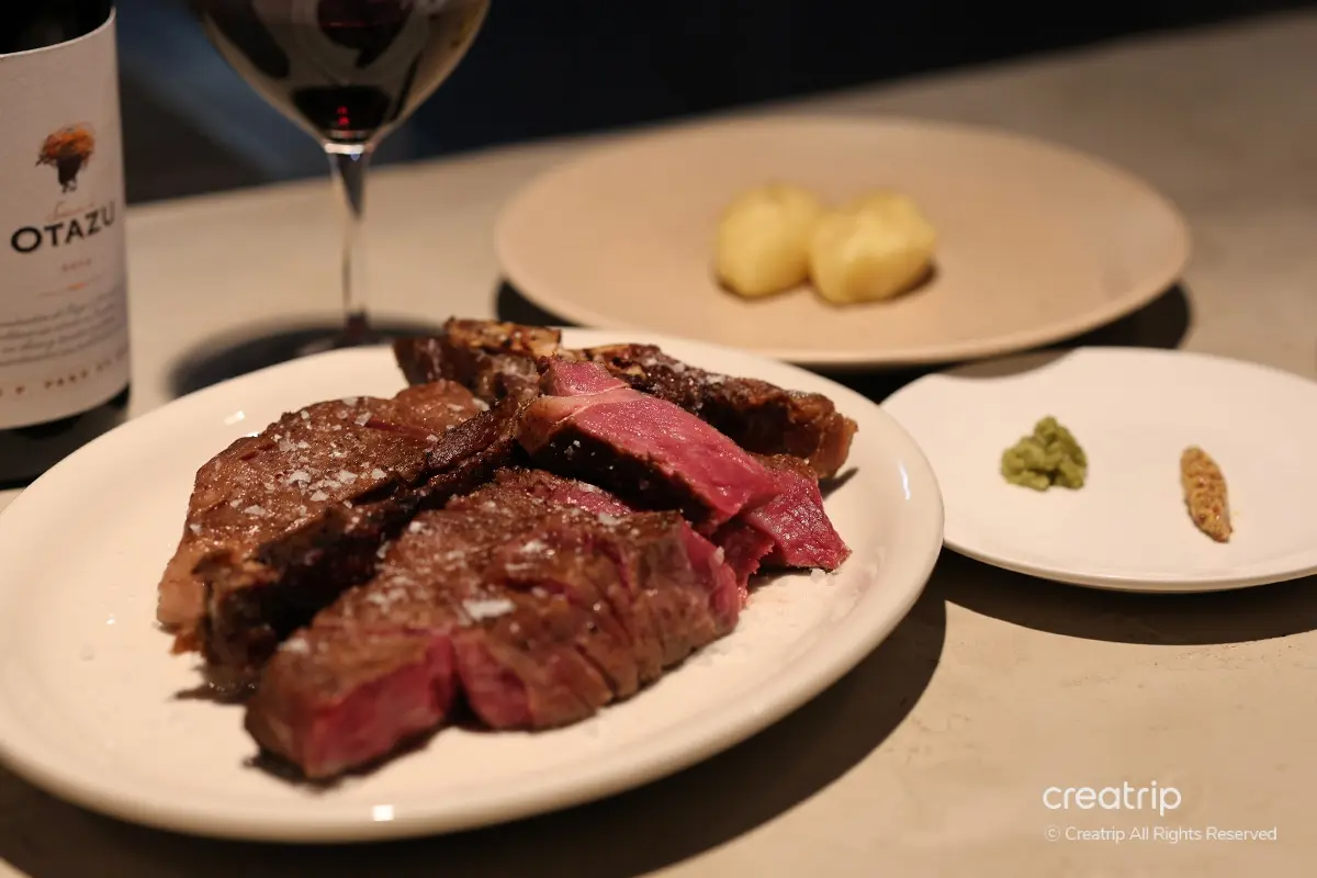 The steak was sprinkled with Maldon salt for added texture. The T-bone steak includes both tenderloin and sirloin sections. It is served with wasabi and whole grain mustard to balance the richness of the meat.