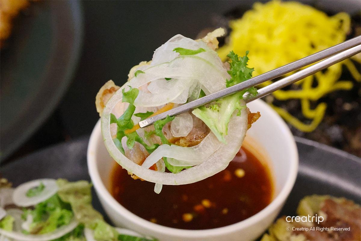 I recommend eating it in one bite with various vegetables provided. Crunchy on the outside and moist on the inside, it's the ultimate taste!