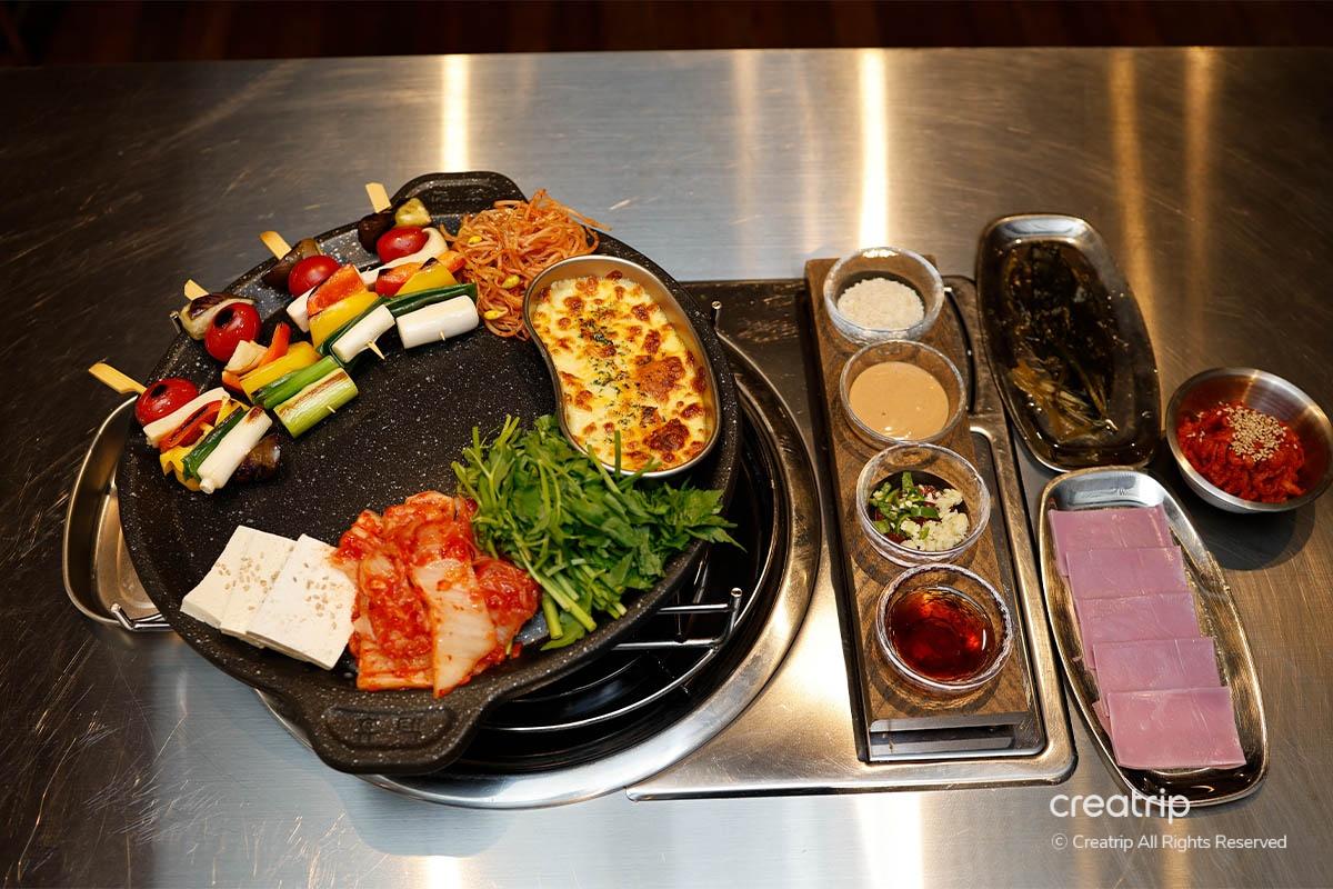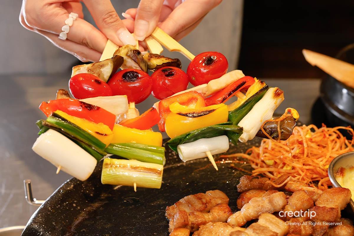 Enjoy authentic Korean BBQ with fresh vegetable skewers and four different sauces.