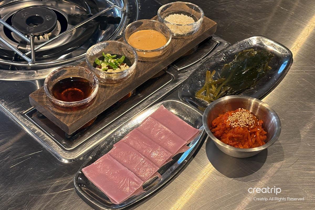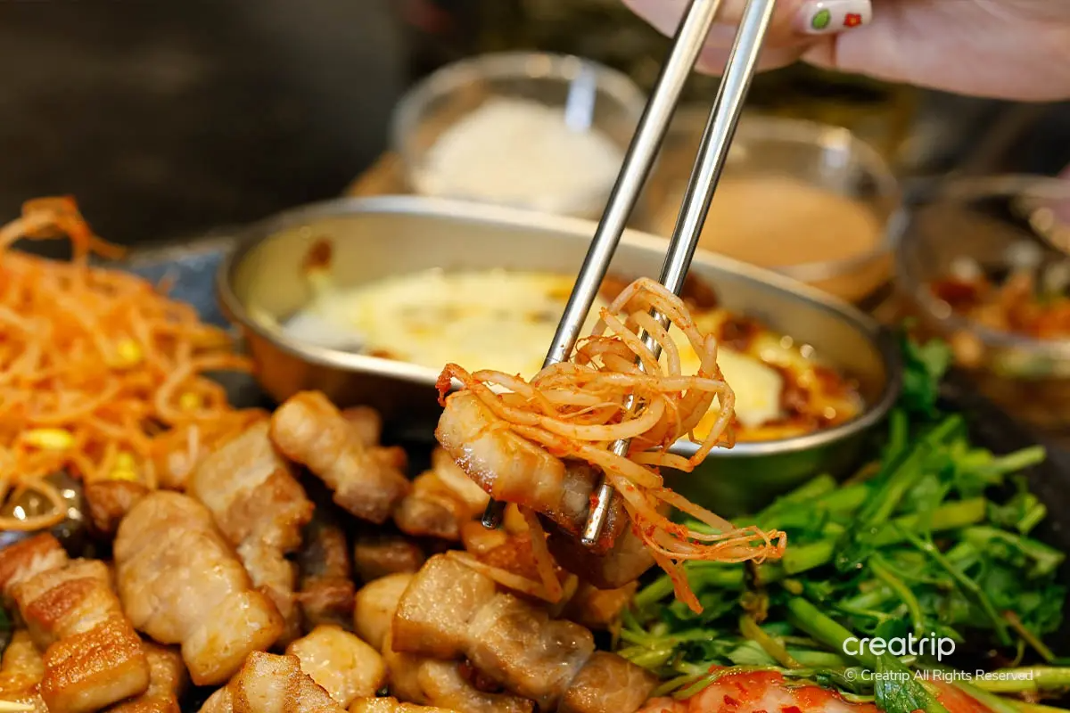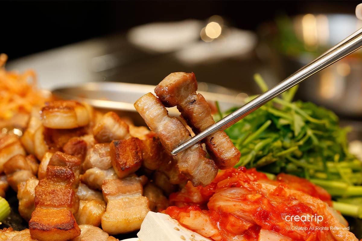 At Yuksanjang, along with the pork belly, a variety of side dishes are provided to enhance the meal.