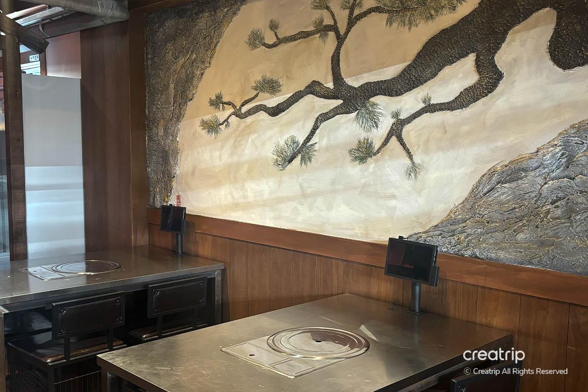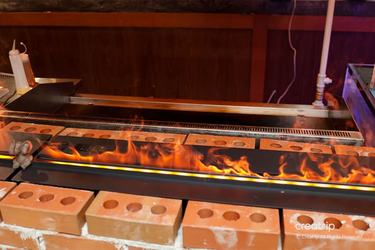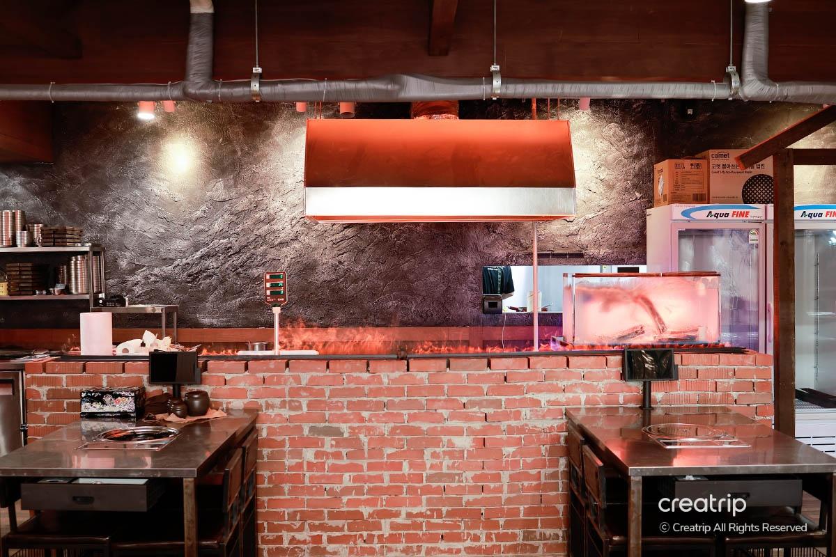 In the center of Yuksanjang, there’s a large metal grill surrounded by bricks where they cook the meat. A humidifier around the grill gives the illusion of flames, adding a unique and charming touch.