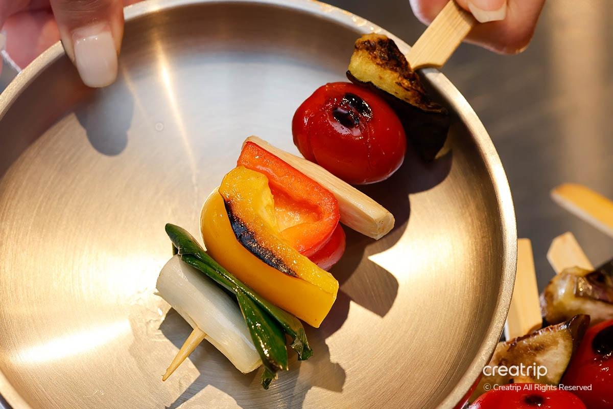There are various vegetable skewers to try, including mushrooms, cherry tomatoes, eggplant, bell peppers, and green onions. Once cooked, they’re removed from the skewers and ready to enjoy.