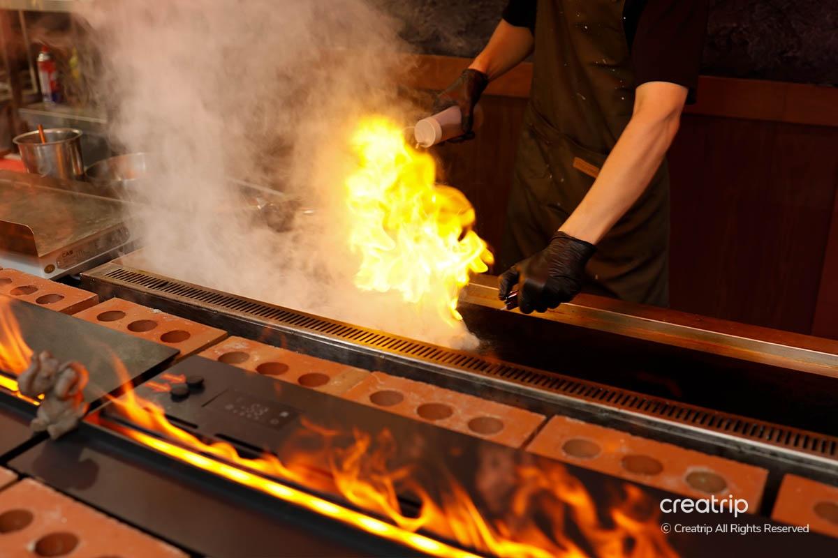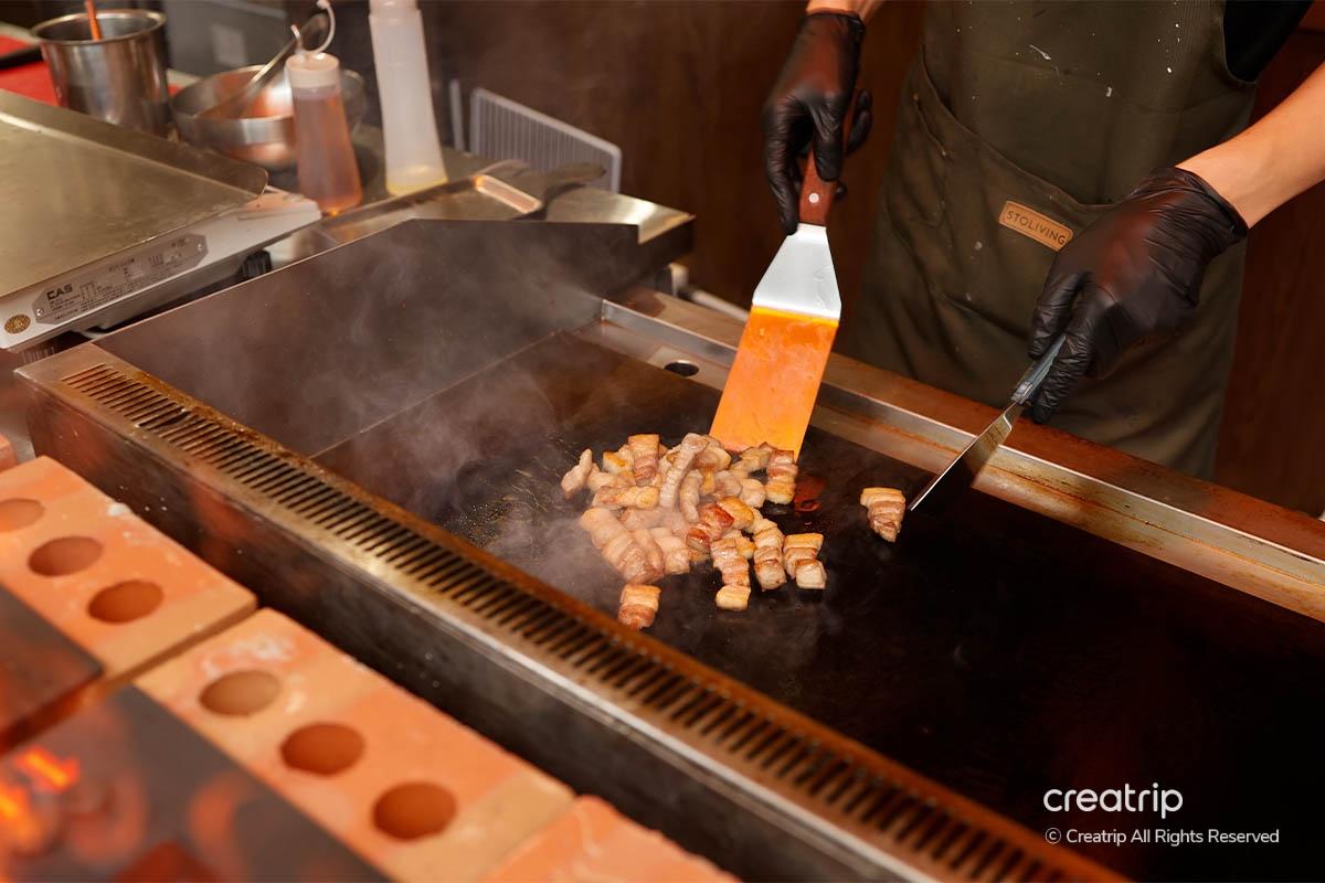 The pork belly we ordered is being grilled on the large iron plate. During the grilling process, there's even a fire show, making the wait for the food entertaining.