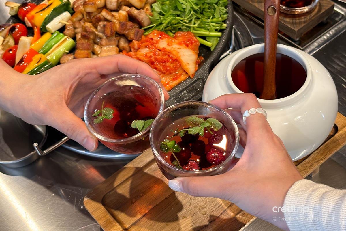 You can't forget the alcohol menu, right? The highball, served in a moon jar, contains strawberries, pears, and cinnamon, offering a fresh and sweet taste. Herb leaves and fruits make this visually striking drink the signature beverage of the restaurant!