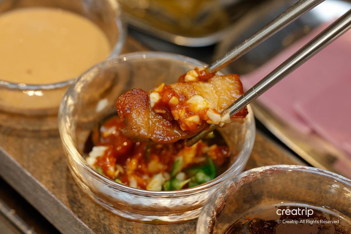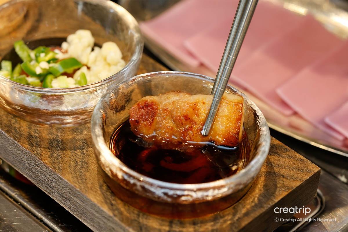 Now, let's try the samgyeopsal! Dip it in the Yuzupon sauce first. The salty soy sauce combined with the refreshing yuzu creates a unique and delicious flavor.