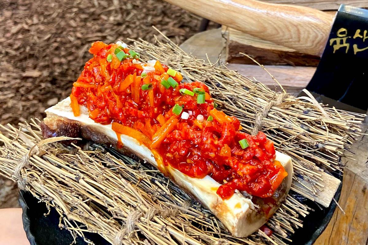 Next, I tried the yukhoe. It’s served on top of a meat bone instead of a plate, giving it a special touch!