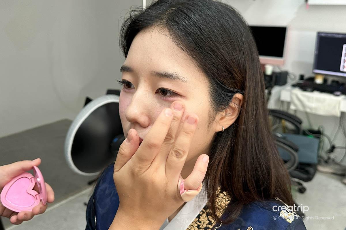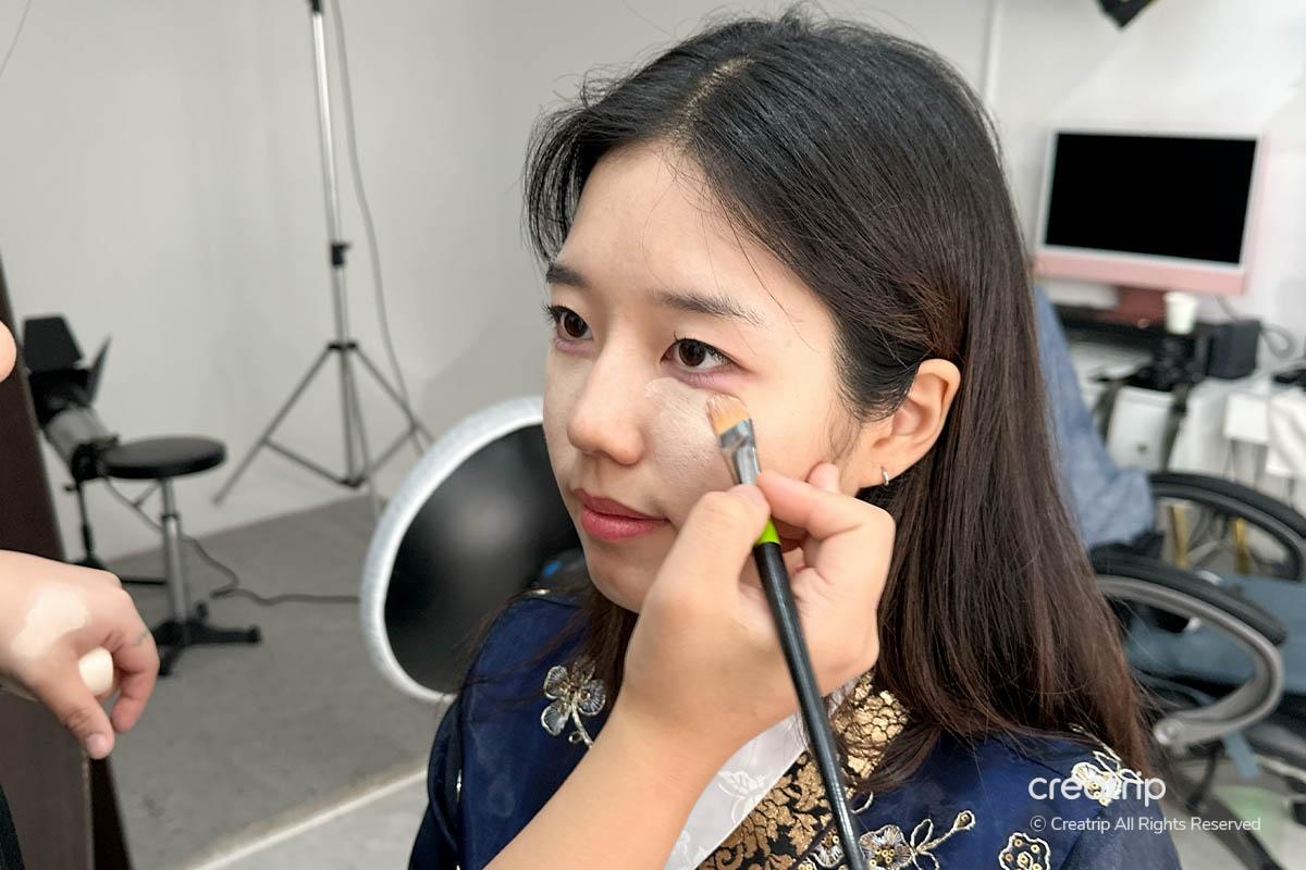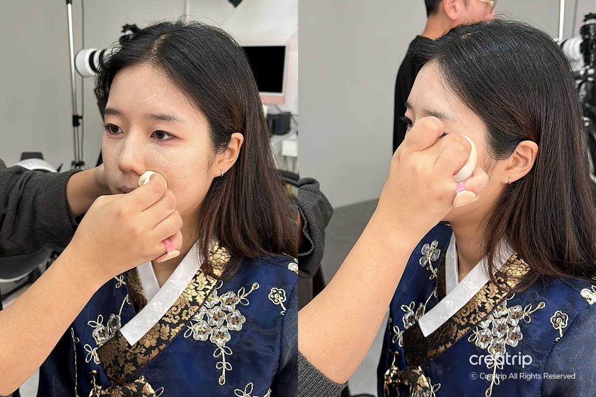 Before starting, the makeup artist asked about my preferred style. I wanted a natural look, so I requested minimal makeup. The first step was the base—using a brush, the artist applied foundation evenly across my face.